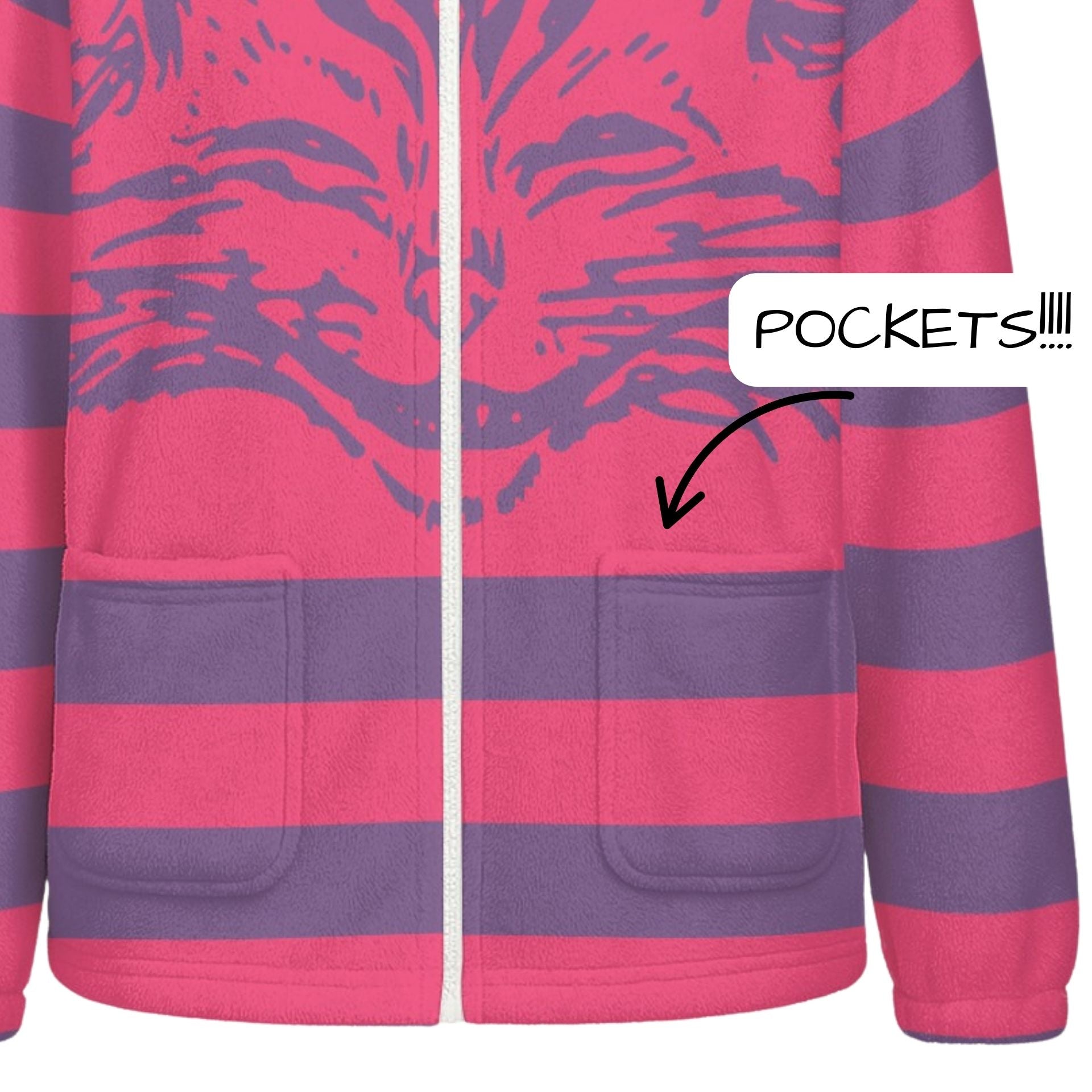 Pink-lila Streifen und ein freches Grinsen der Grinsekatze zieren Vorder- und Rückseite dieses flauschigen Kapuzenpullovers aus Kunstfell mit Reißverschluss und Katzenohren! Das Katzenmotiv stammt aus den Originalillustrationen von Alice im Wunderland. Ich habe den Pullover speziell für Schwarzlicht entworfen, daher leuchten die beiden Pink- und Lilatöne unter Schwarzlicht einfach fantastisch. Zwei aufgesetzte Taschen vorne bieten Platz für Lipgloss, Schmuck oder um die Pfoten warmzuhalten.