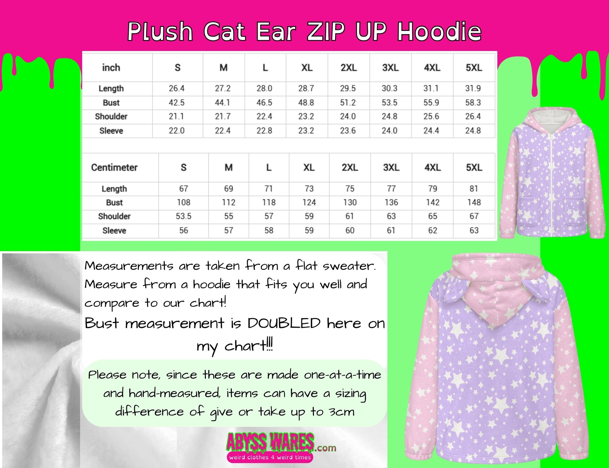 ● Eigenschaften: Superweiches, flauschiges Plüschmaterial, aufgesetzte Taschen, Katzenohren an der Kapuze, durchgehender Reißverschluss
