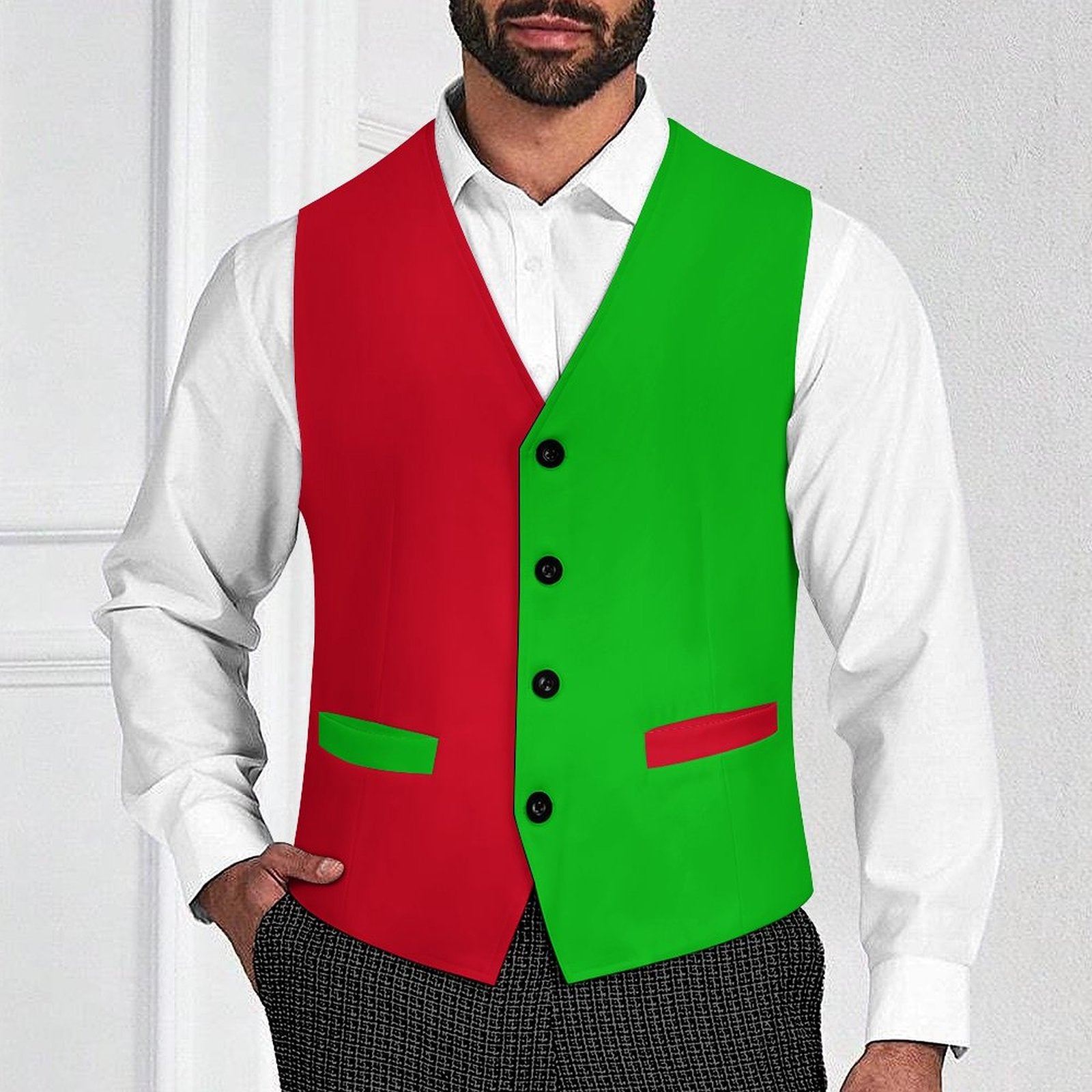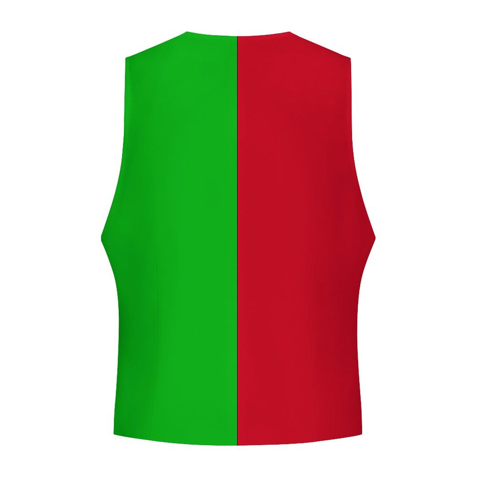 Elegante Herrenweste im Elfen- oder Clown-Stil in Rot und Grün mit vier Knöpfen und Vordertaschen. Vorder- und Rückseite mit vollfarbigem Print! US-Herrengrößen S–3XL