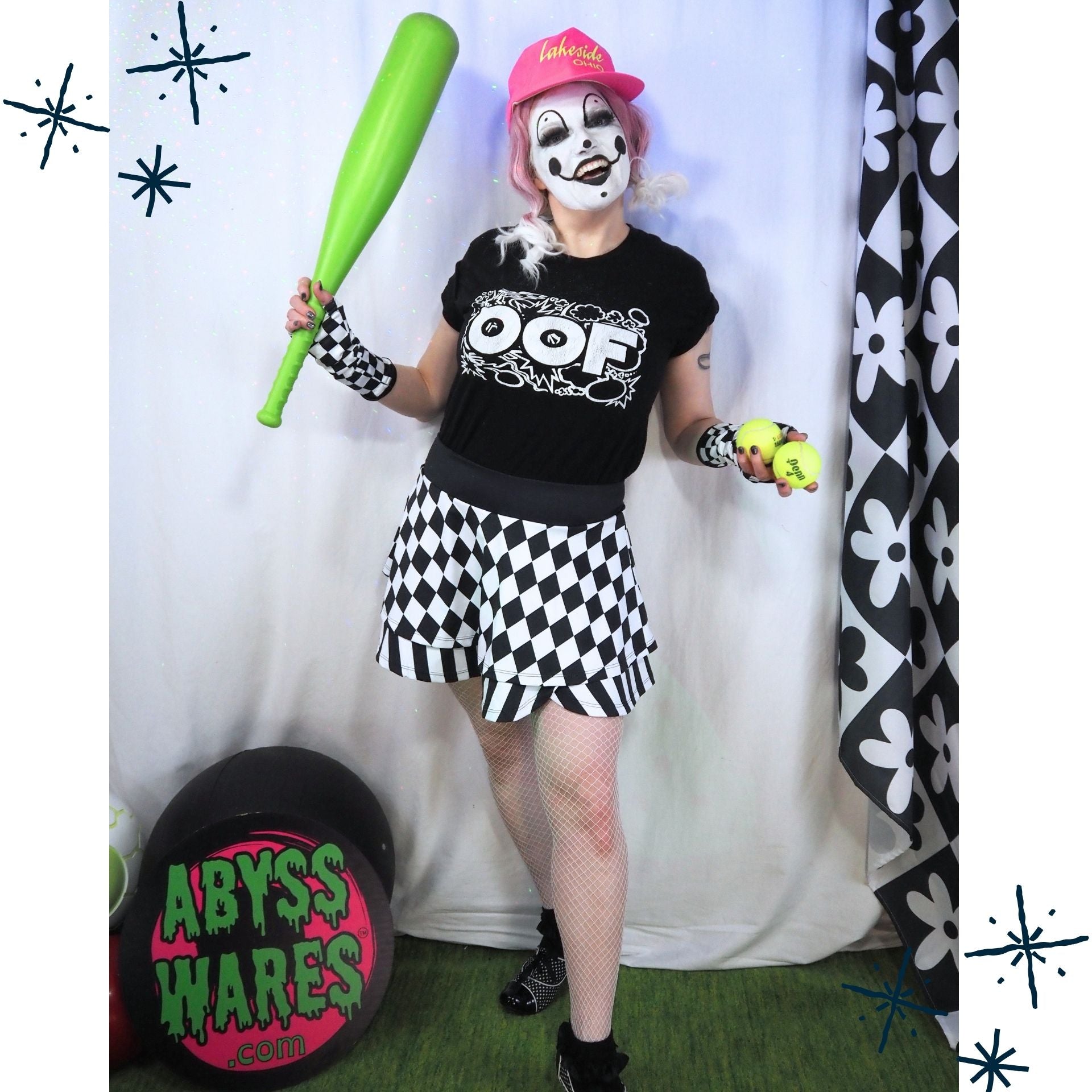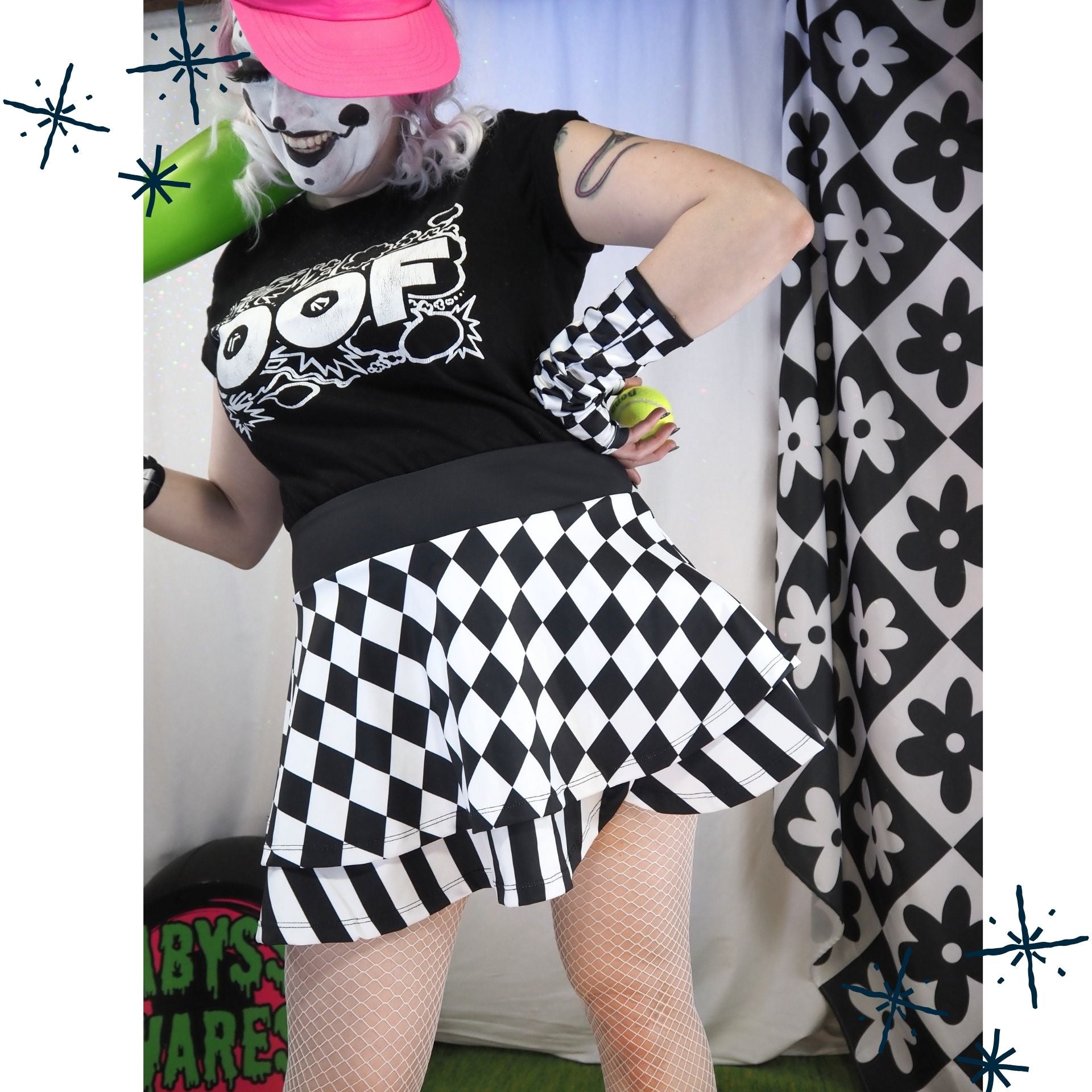 Bold black and white harlequin diamonds and stripes on a cute clowny and practical mini skirt skort! The pockets are perfect for your clown props or tennis balls, I suppose.