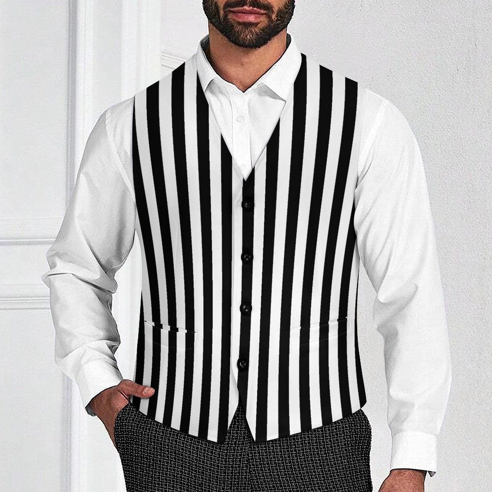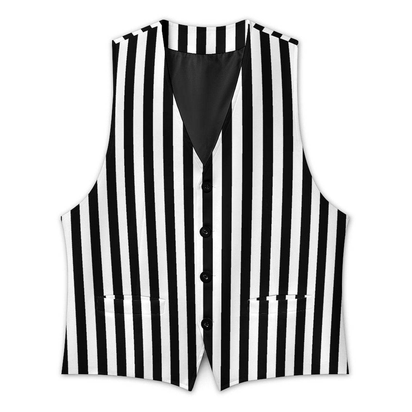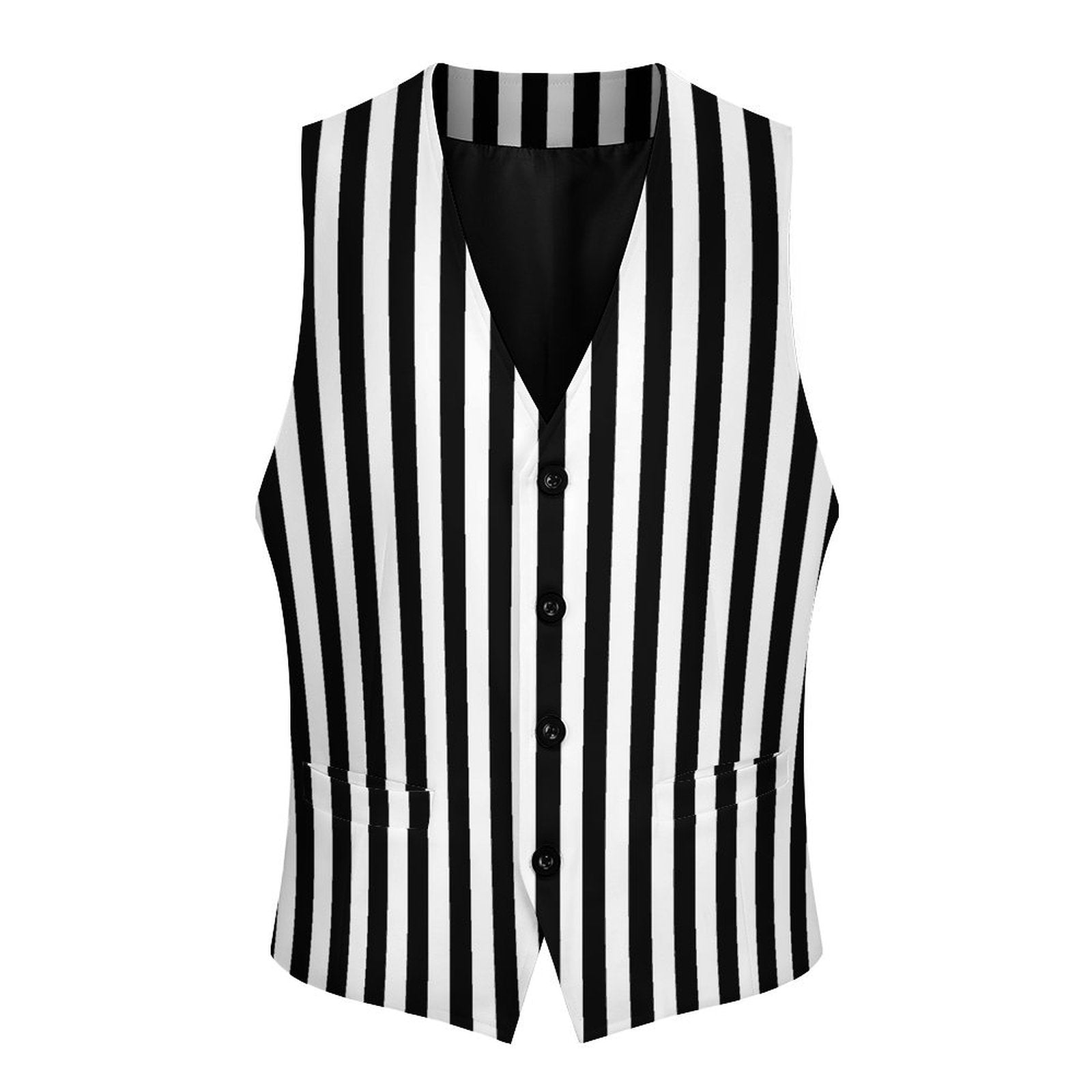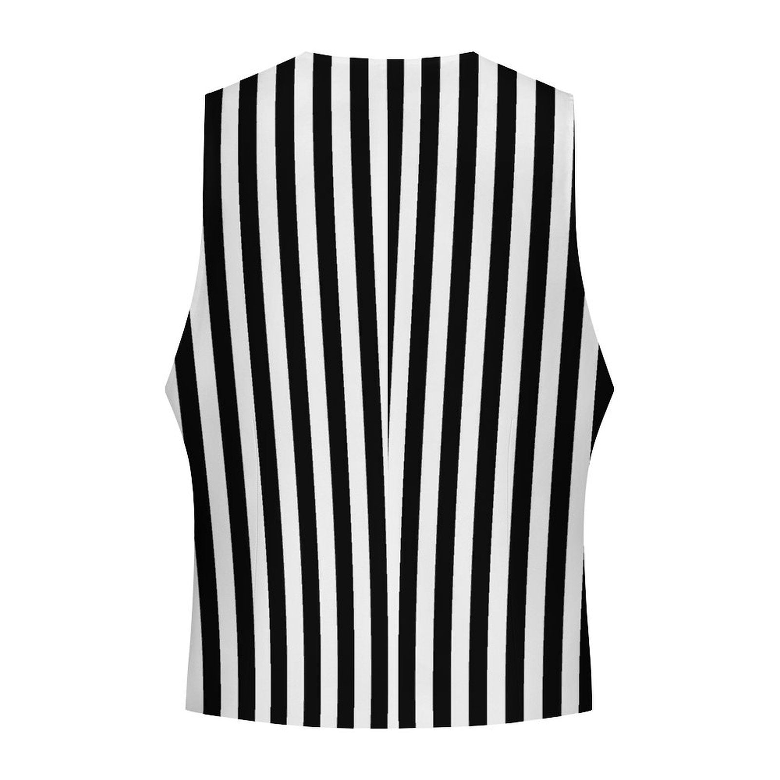 Elegante Herrenweste mit Zirkusstreifen im Pierrot-Clown-Stil in Schwarz-Weiß, mit 4 Knöpfen und Vordertaschen. Das Muster ist beidseitig bedruckt. Erhältlich in US-Herrengrößen S-3XL.