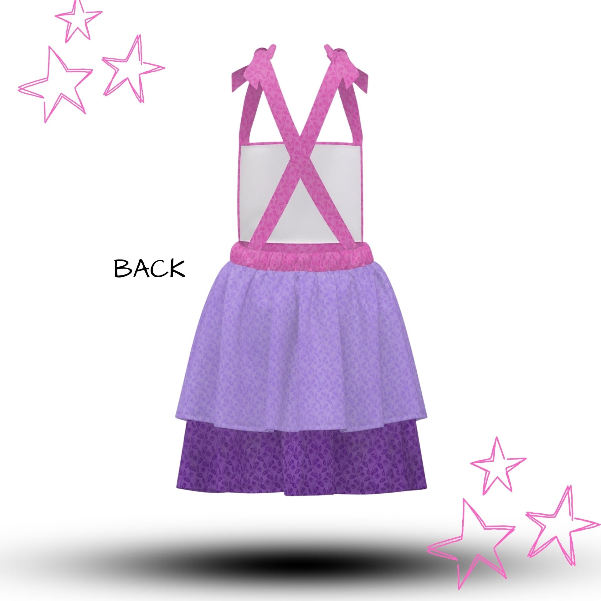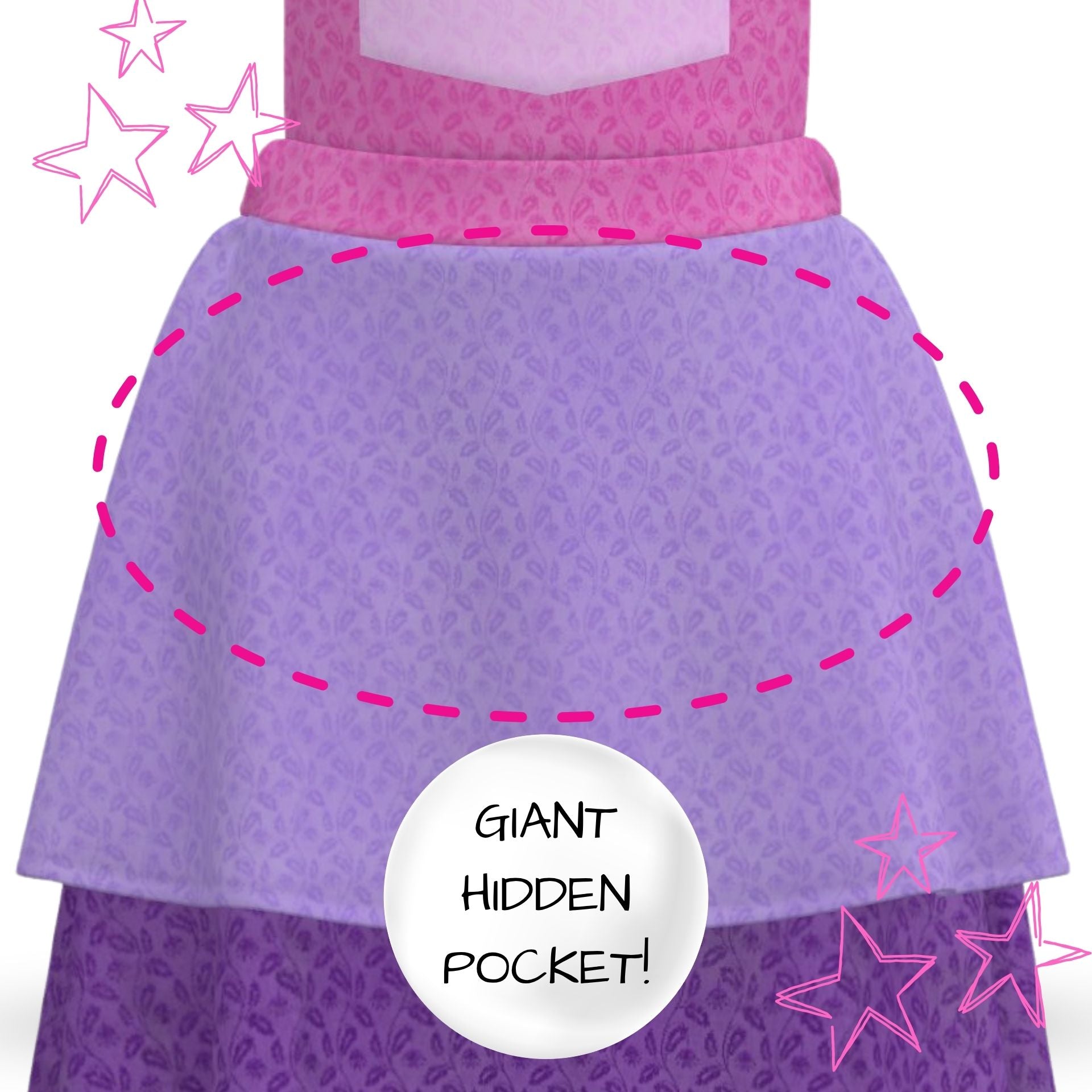 Features: Hidden kangaroo pocket, adjustable straps, chest pocket, elastic waist, 2-teir ruffle circle skirt