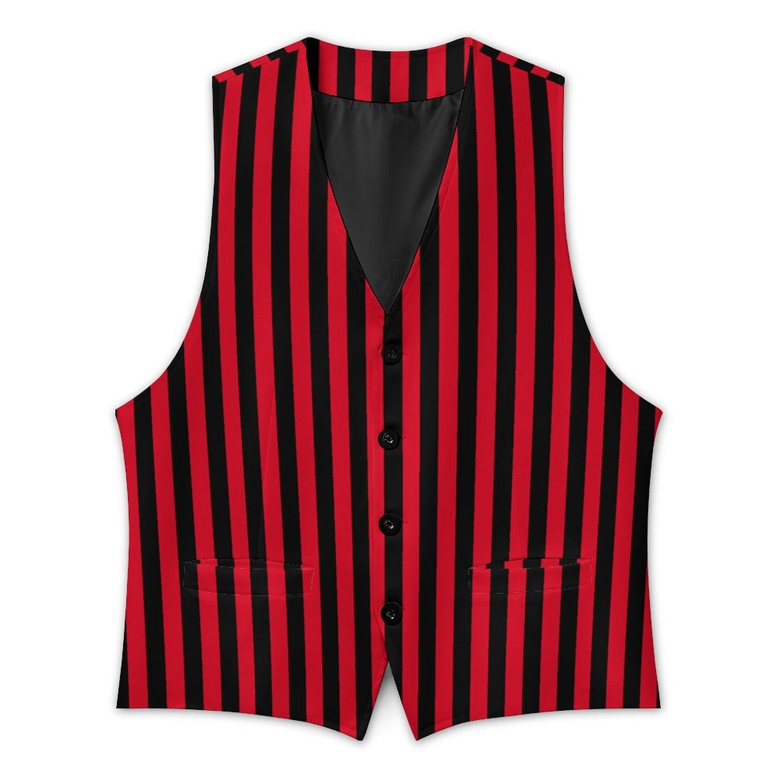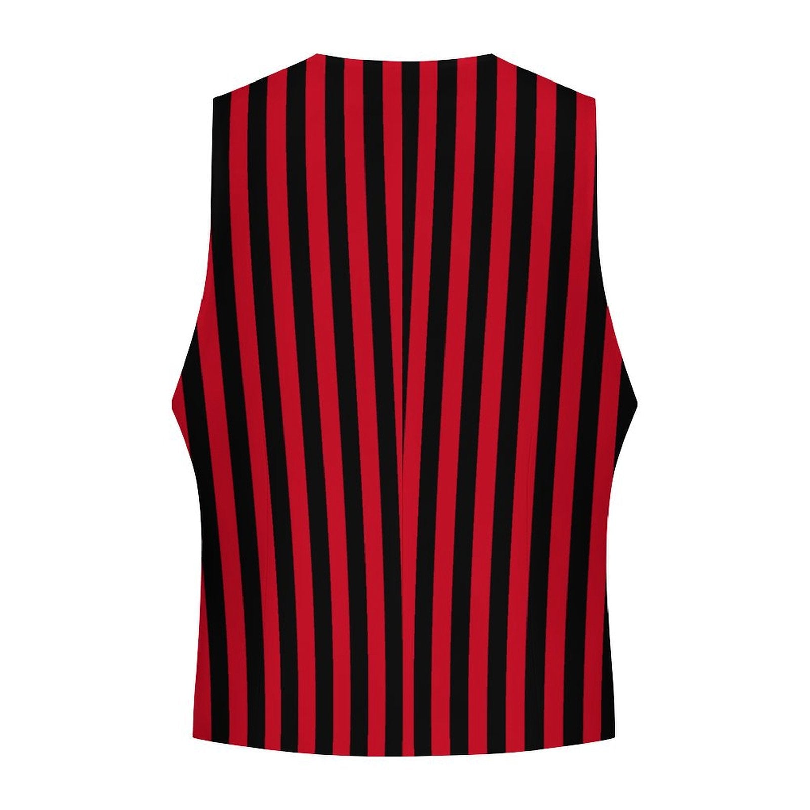 Rot-schwarz gestreifte Herren-Clownweste mit 4 Knöpfen und Vordertaschen. US-Herrengrößen S–3XL. Ideal für Cosplay und düstere Zirkuskostüme.