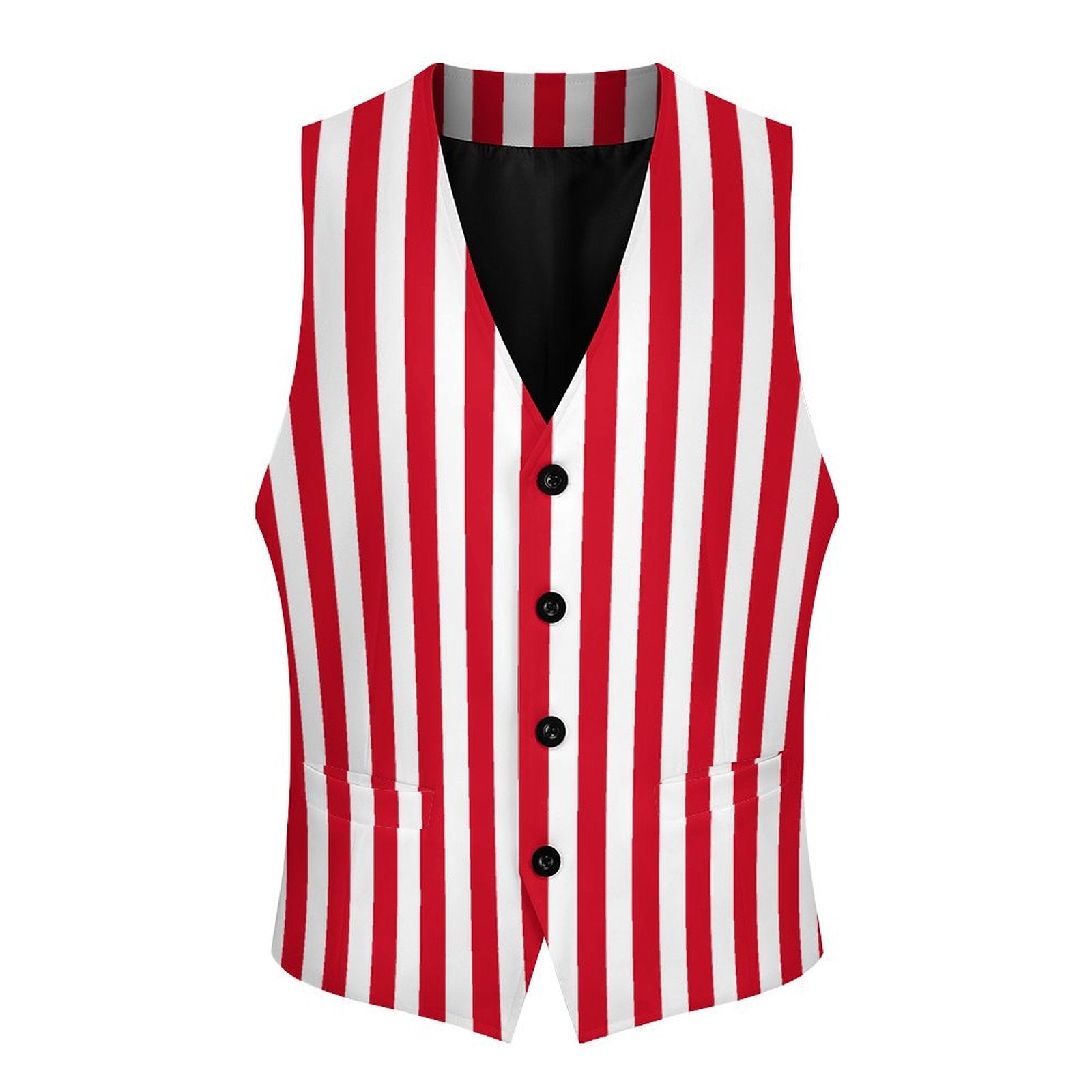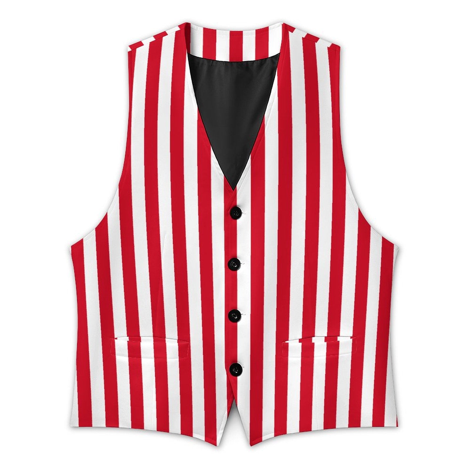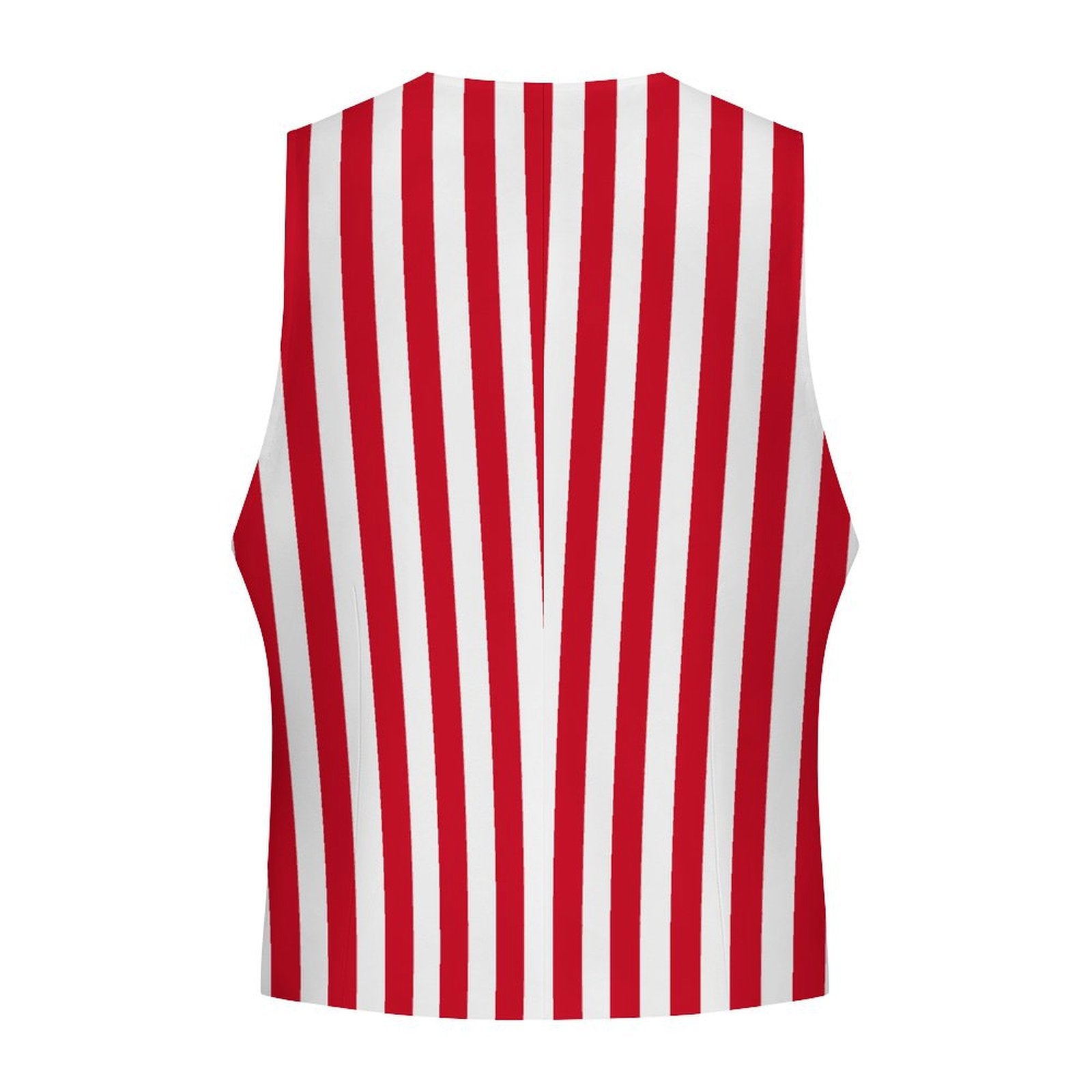 Rot-weiß gestreifte Herren-Clownweste mit 4 Knöpfen und Vordertaschen. Komplett bedruckt auf Vorder- und Rückseite! US-Herrengrößen S–3XL