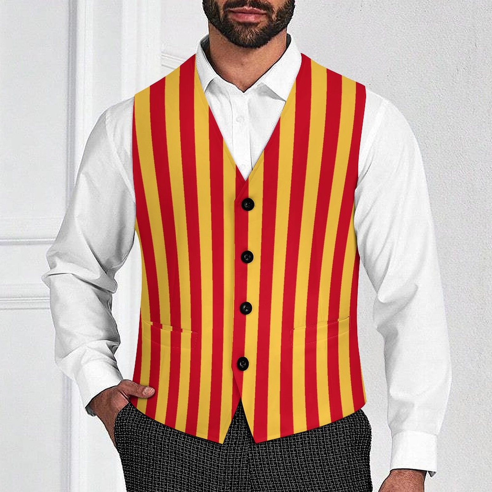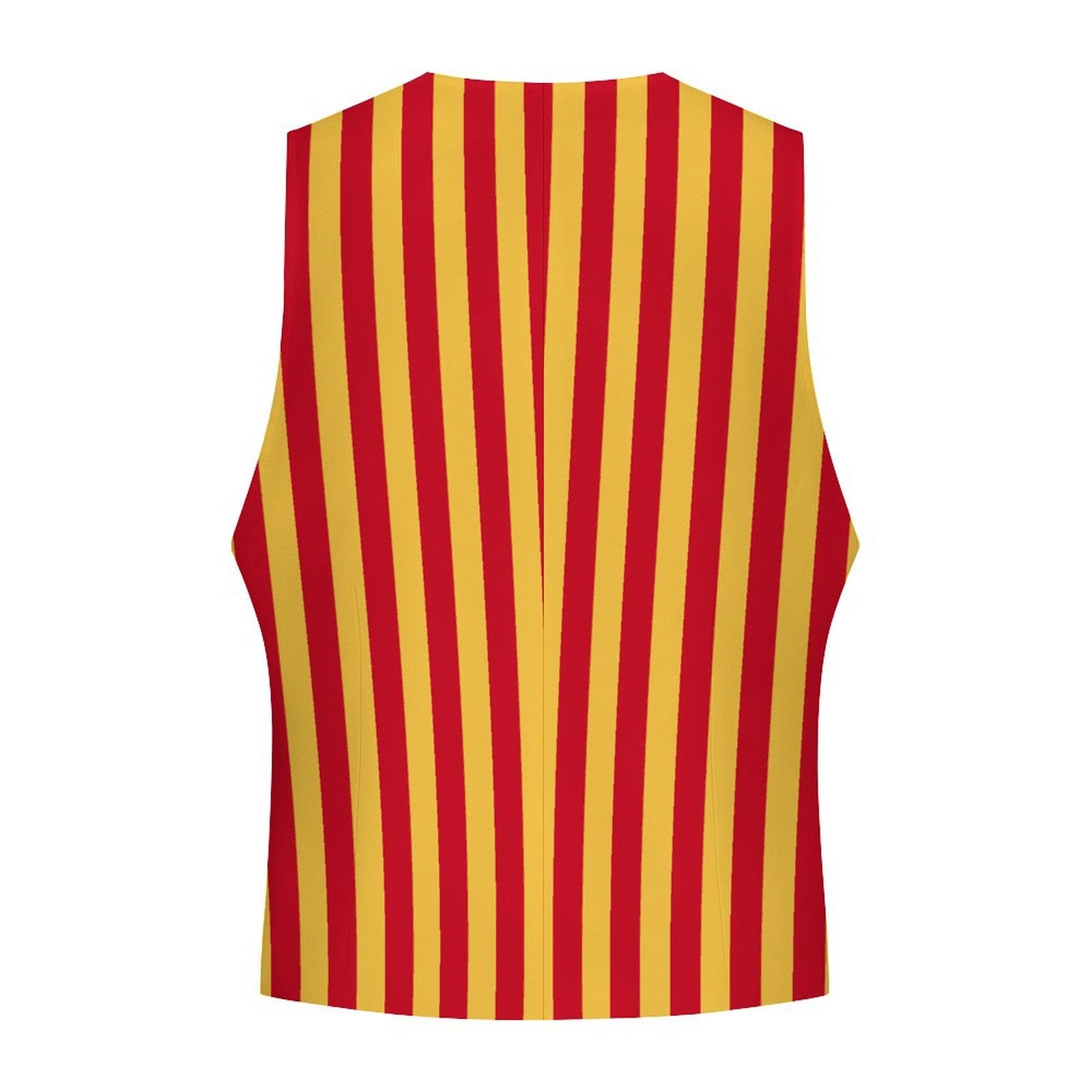 Fröhliche, rot-gelb gestreifte Herren-Clownweste mit 4 Knöpfen und Vordertaschen. Vollflächiger, farbenfroher Druck auf Vorder- und Rückseite! US-Herrengrößen S–3XL