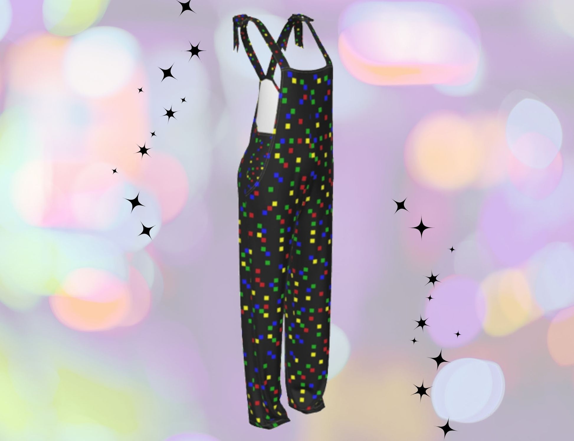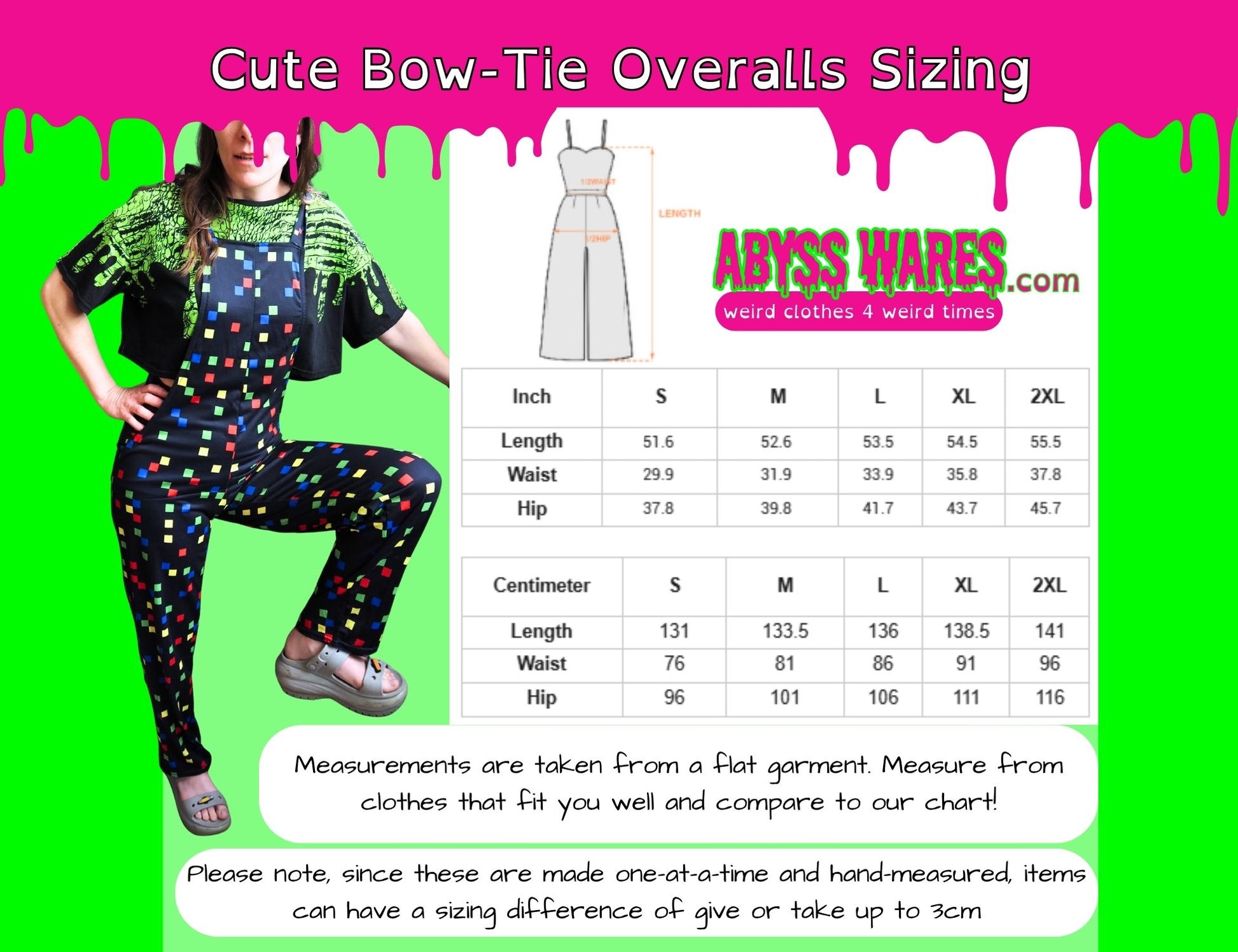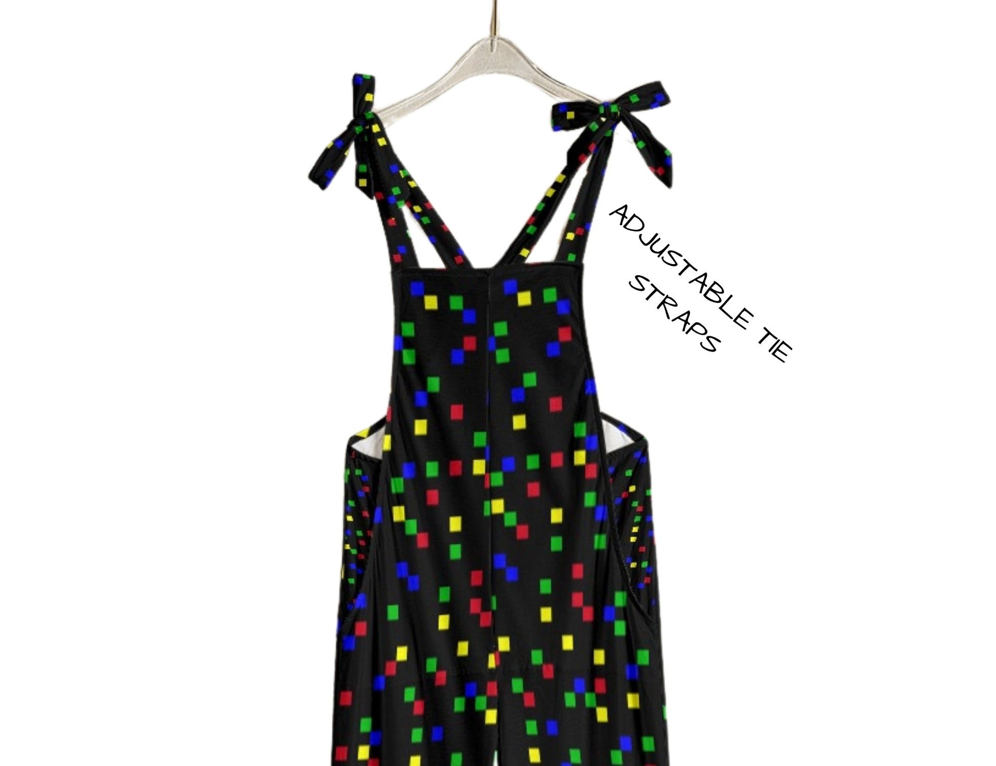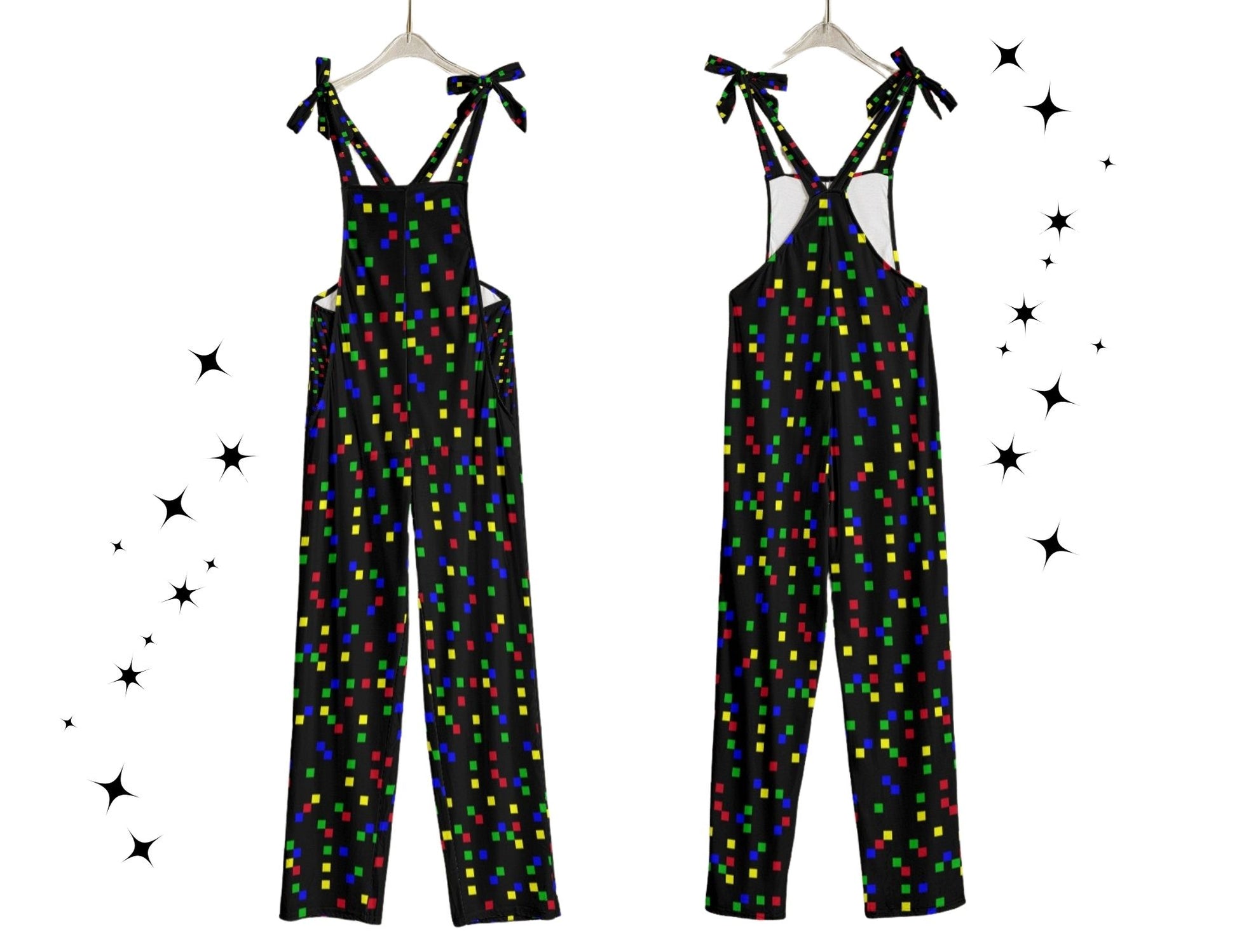 Diversión kidcore nostálgica de los 90 con cuadrados pixelados en negro y colores festivos sobre un mono de juego deliciosamente elástico. Ideal para tu look kidcore clowncore decora kei, ¡no te lo querrás quitar! Los tirantes se atan en adorables lazos :) La tela es de poliéster jersey suave y cómodo.