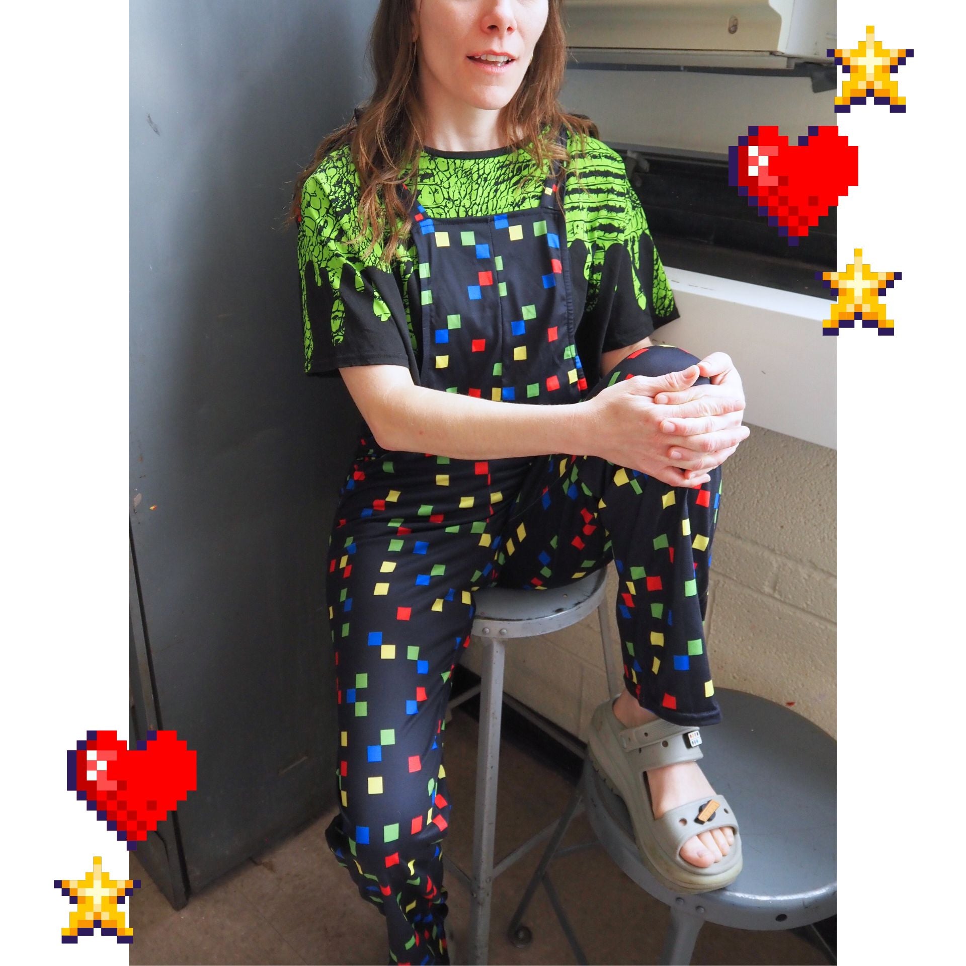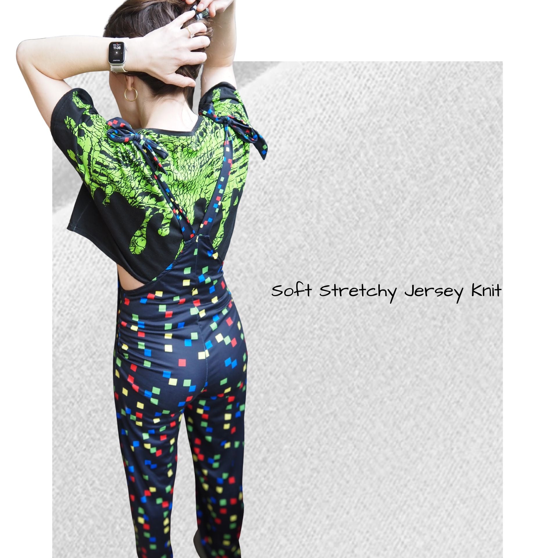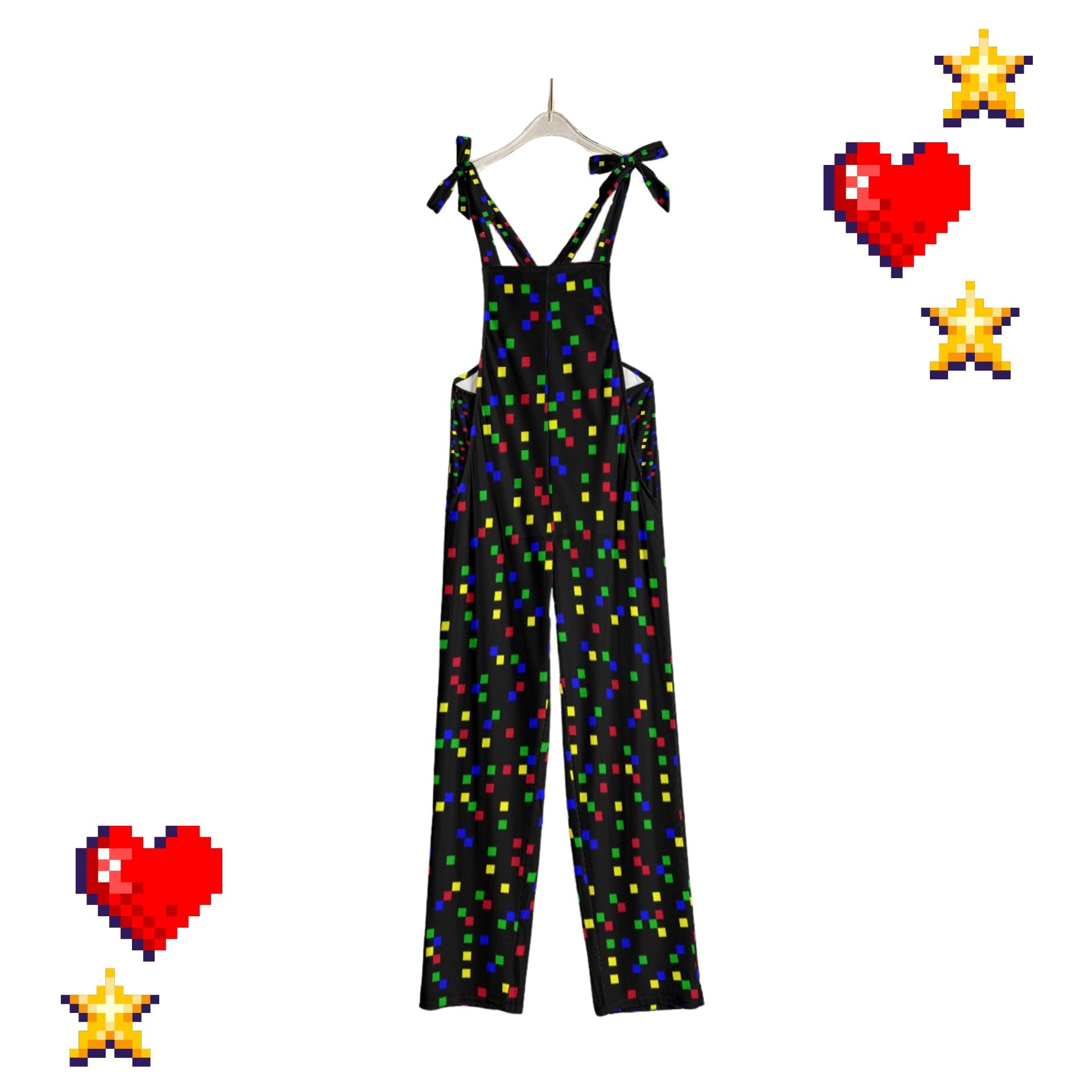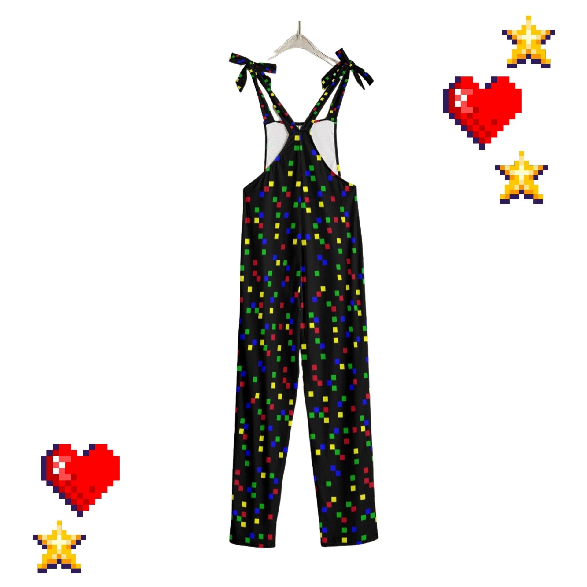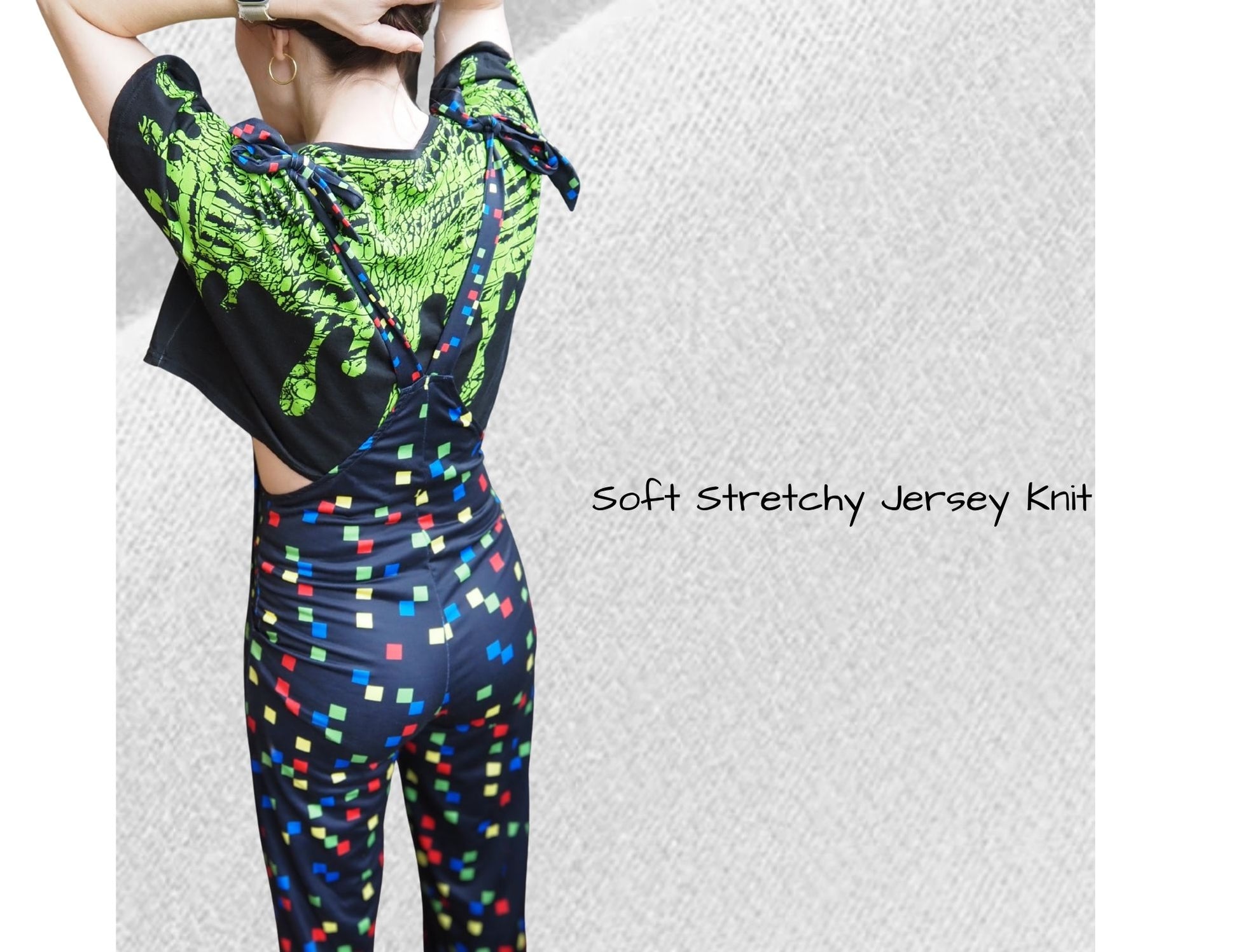Diversión kidcore nostálgica de los 90 con cuadrados pixelados en negro y colores festivos sobre un mono de juego deliciosamente elástico. Ideal para tu look kidcore clowncore decora kei, ¡no te lo querrás quitar! Los tirantes se atan en adorables lazos :) La tela es de poliéster jersey suave y cómodo.