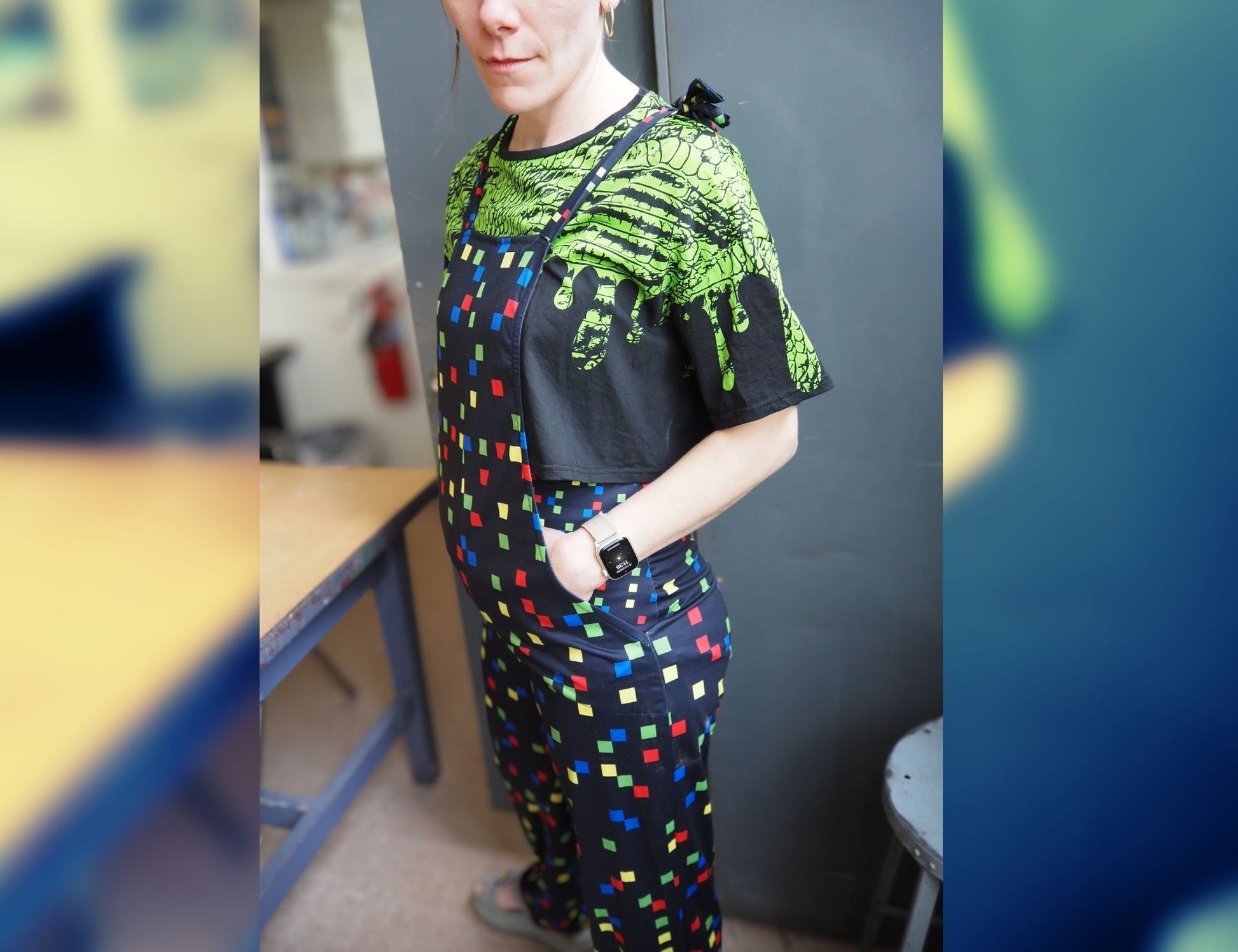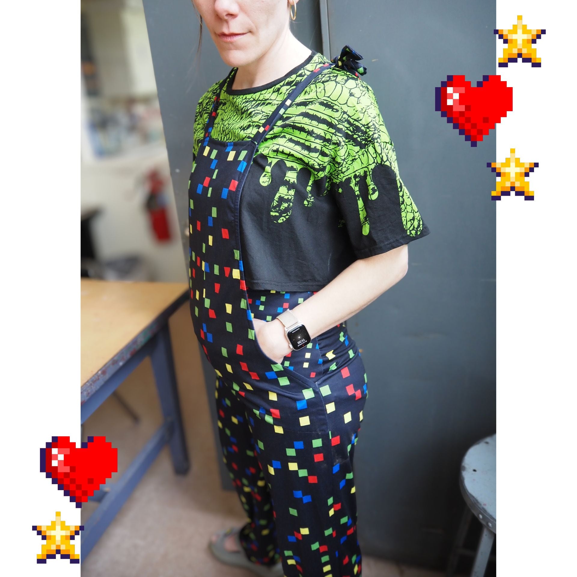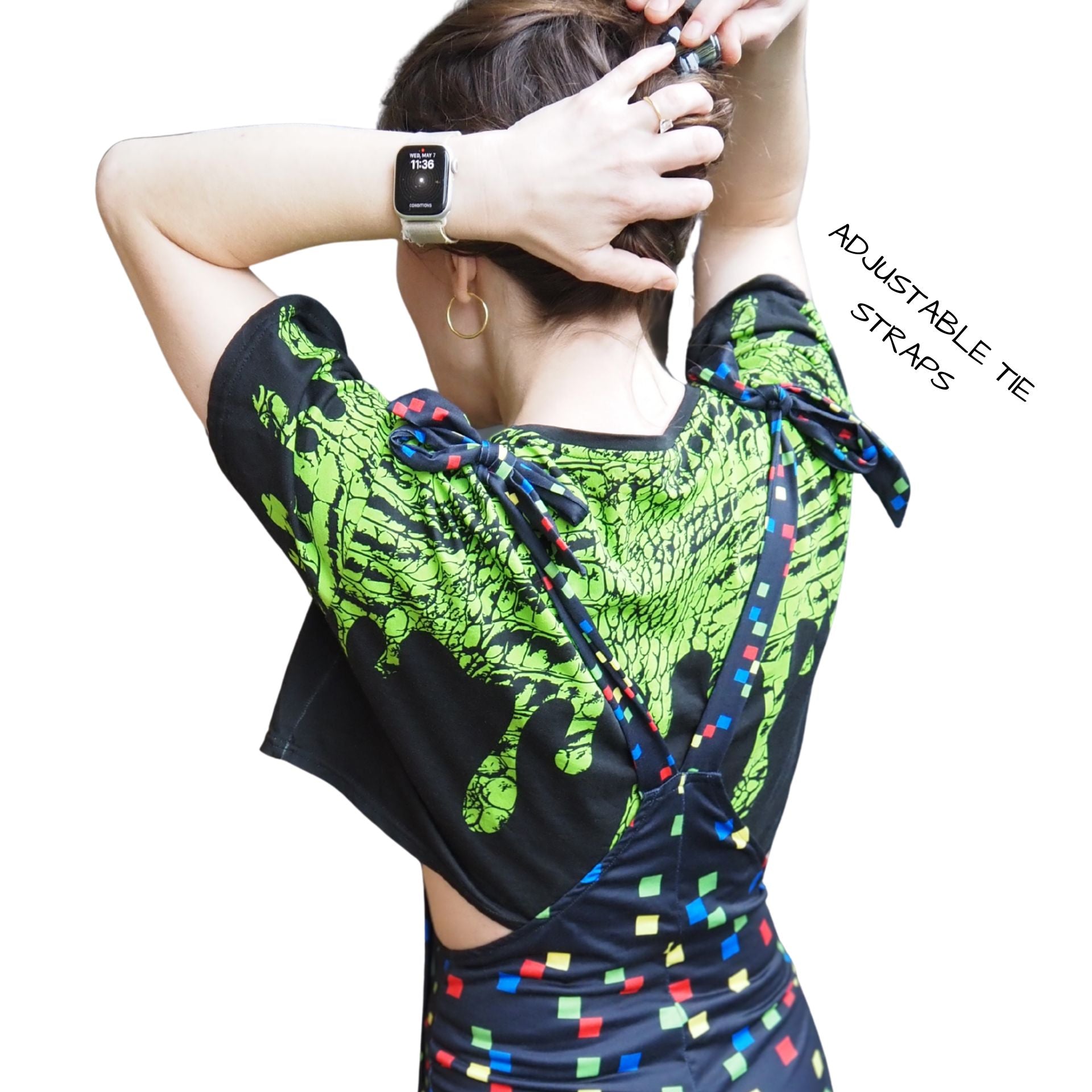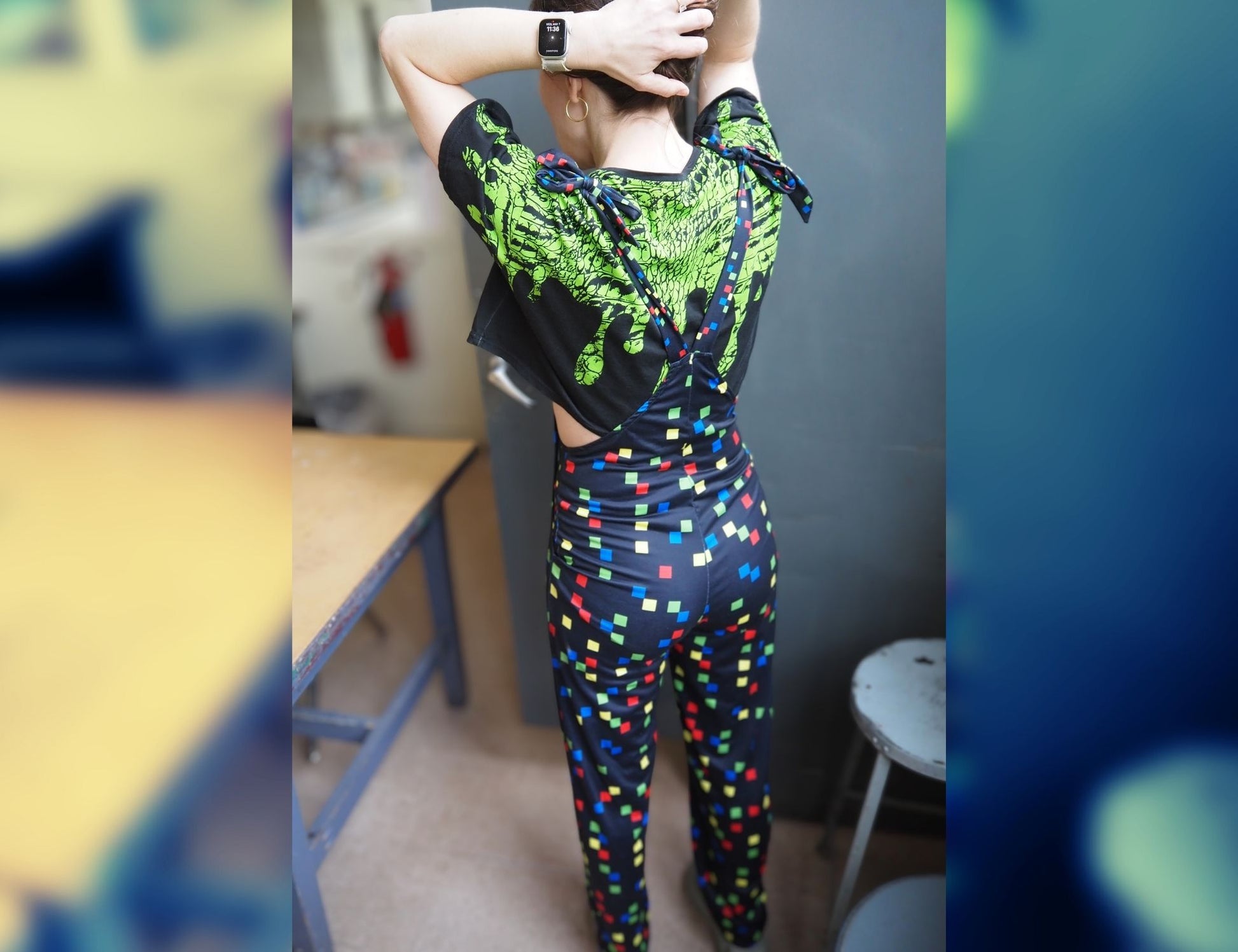 Diversión kidcore nostálgica de los 90 con cuadrados pixelados en negro y colores festivos sobre un mono de juego deliciosamente elástico. Ideal para tu look kidcore clowncore decora kei, ¡no te lo querrás quitar! Los tirantes se atan en adorables lazos :) La tela es de poliéster jersey suave y cómodo.