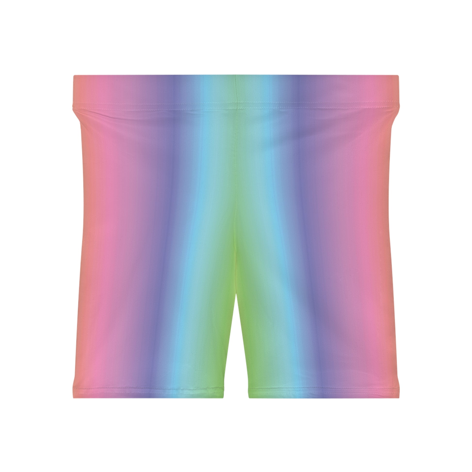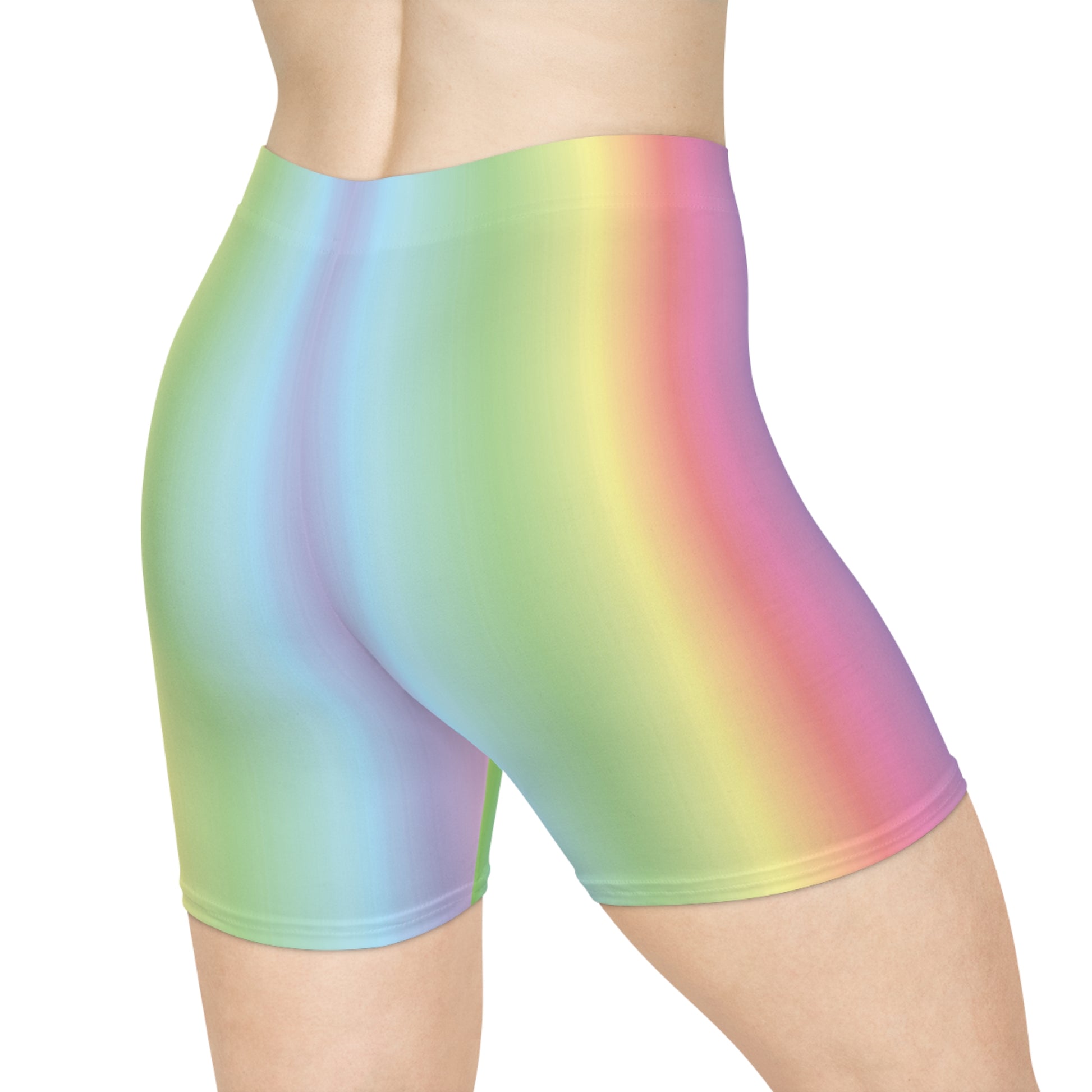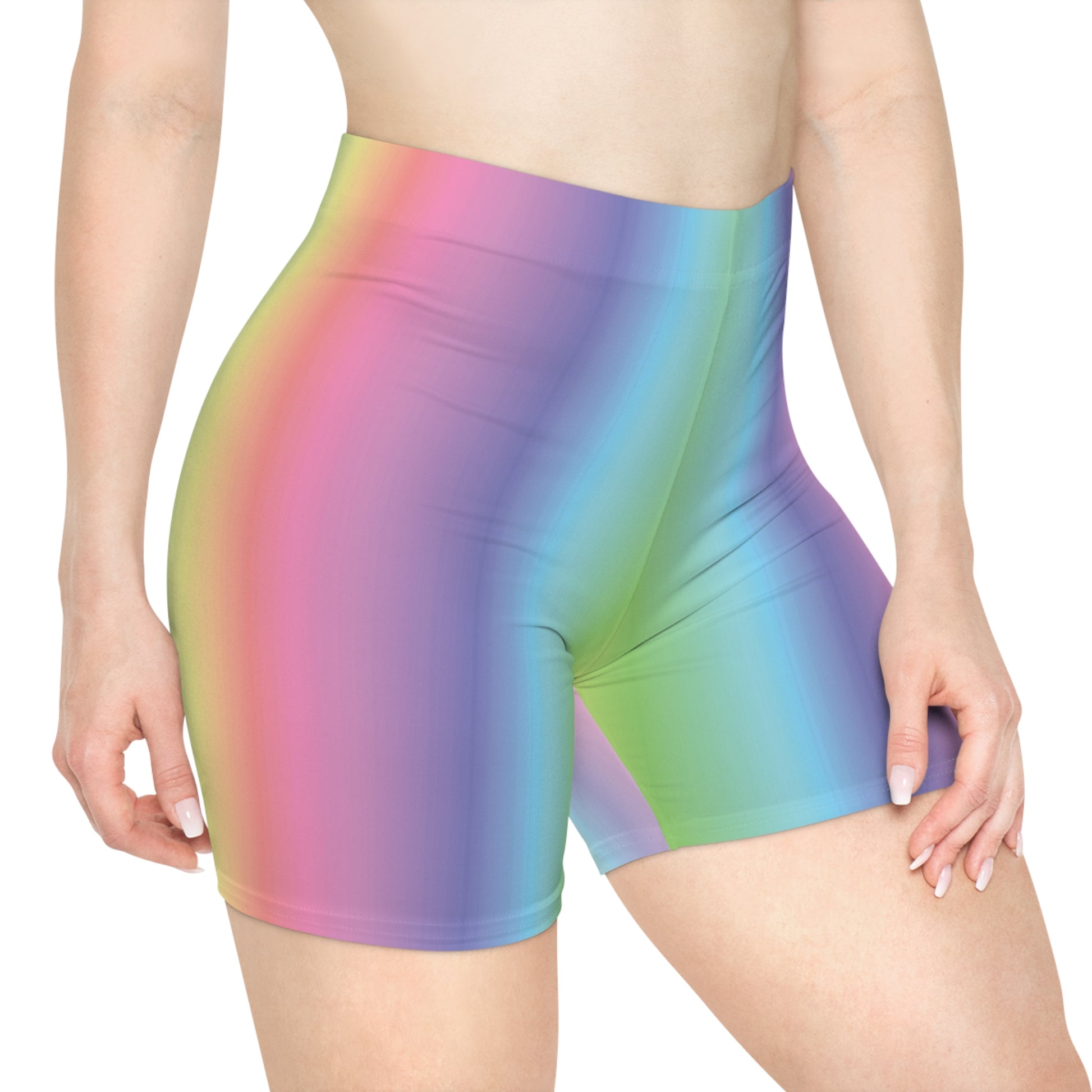 Nuestros shorts ciclistas Gentle Rainbow para mujer, súper cómodos y elásticos, son perfectos para tu atuendo del Orgullo, disfraces de payaso, yoga, entrenamiento o gimnasia. Hechos en EE. UU. con un colorido diseño degradado, estos shorts transmiten un toque divertido y alegre. Ideales para quienes disfrutan de estilos únicos y originales. Perfectos para disfraces de Halloween, fiestas temáticas del Orgullo o acrobacias.