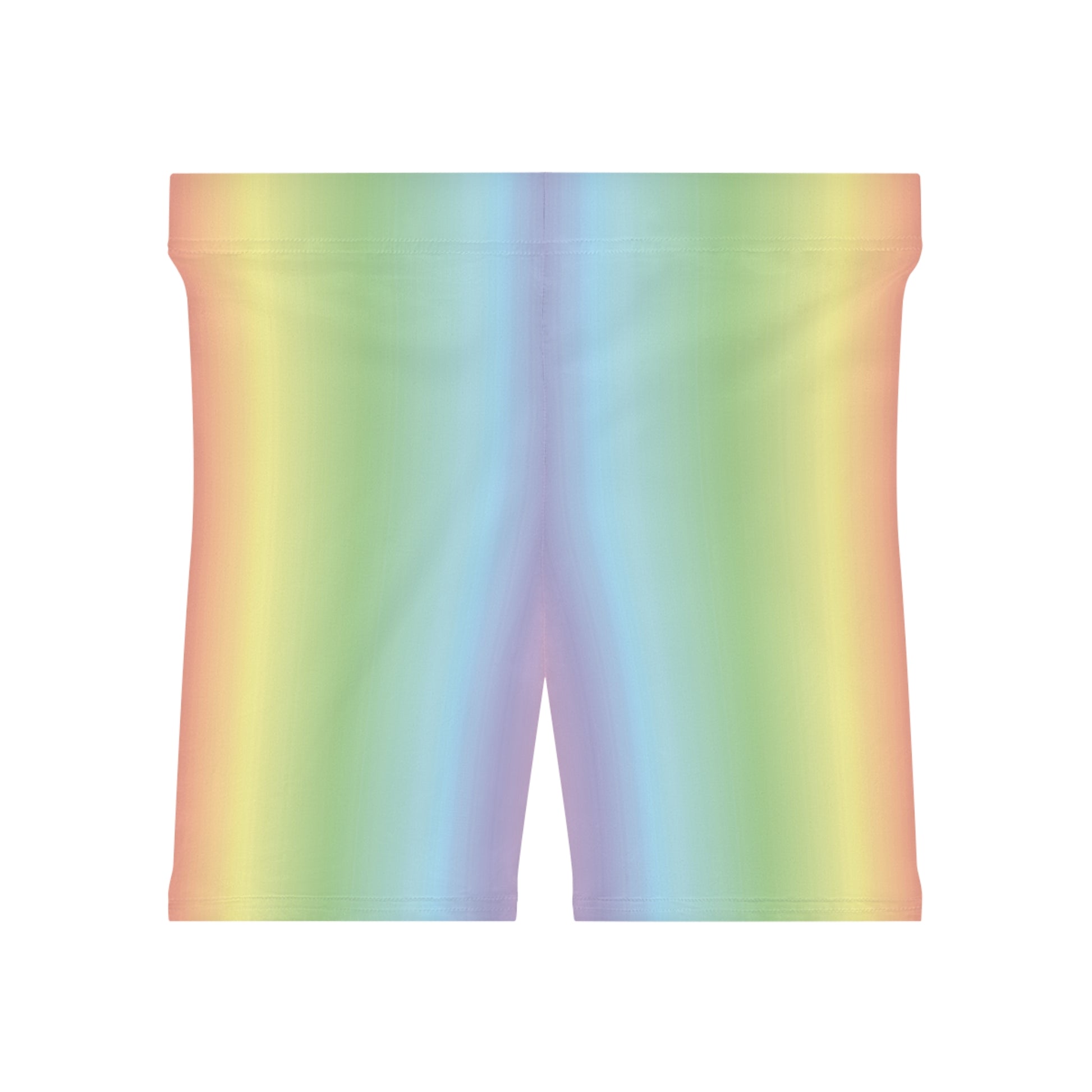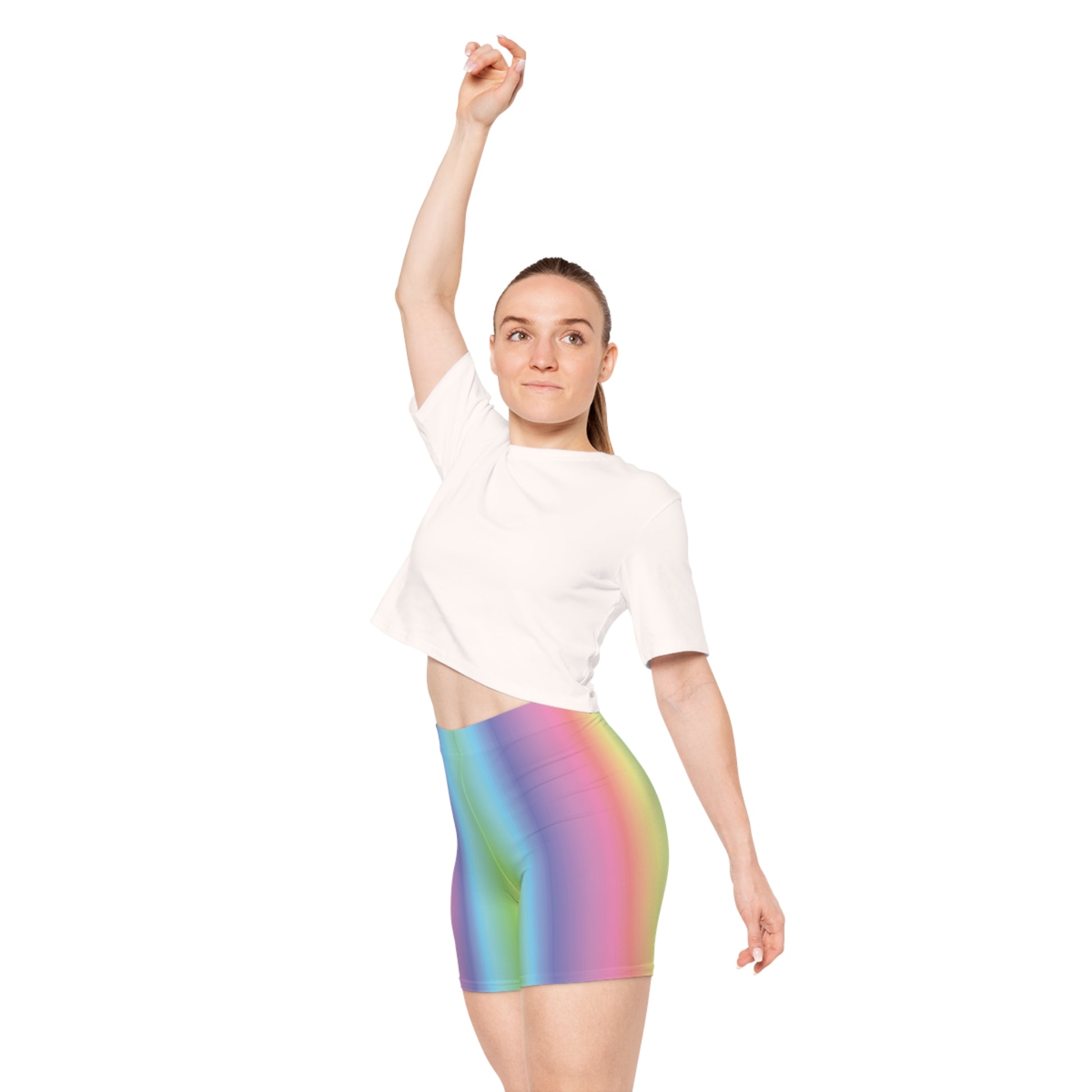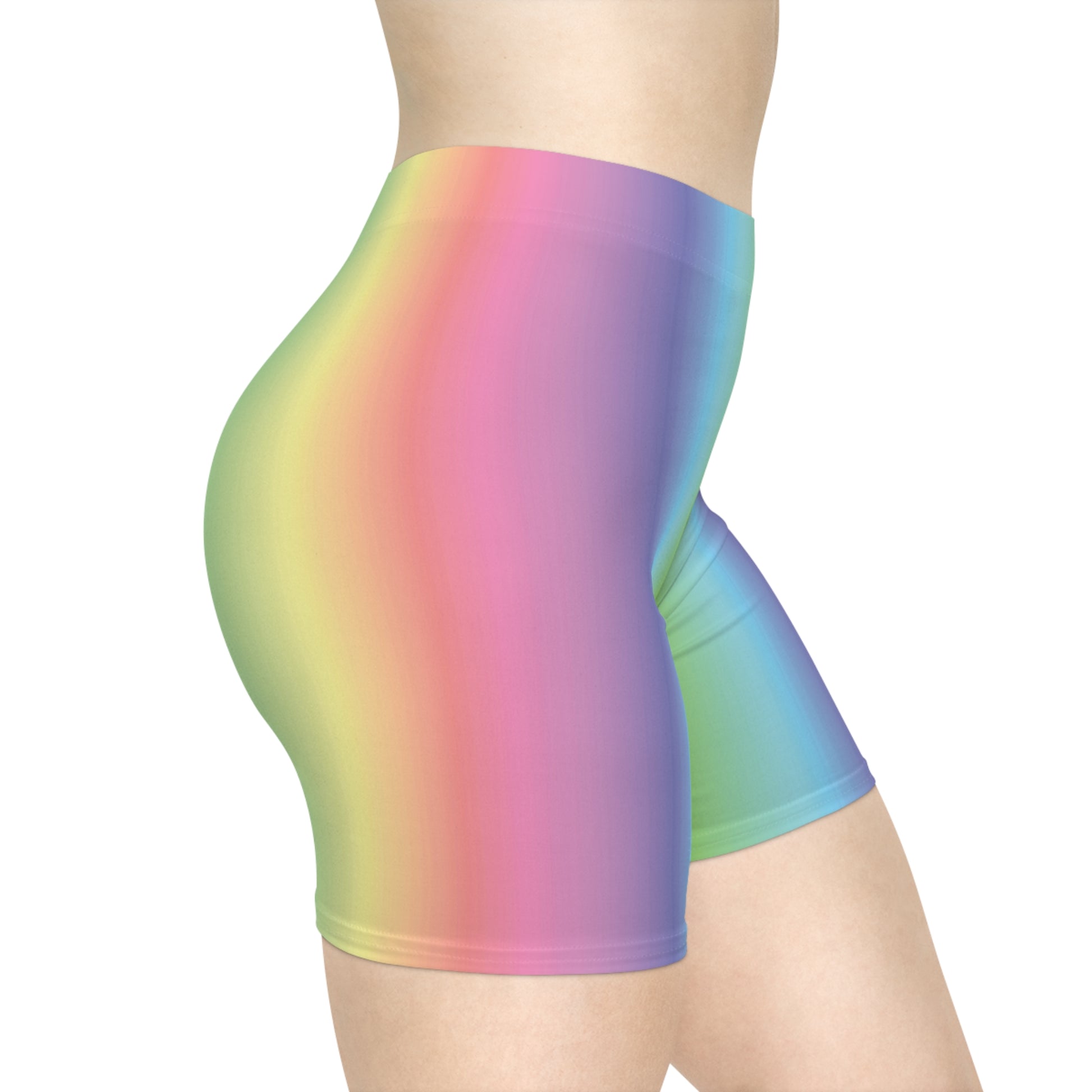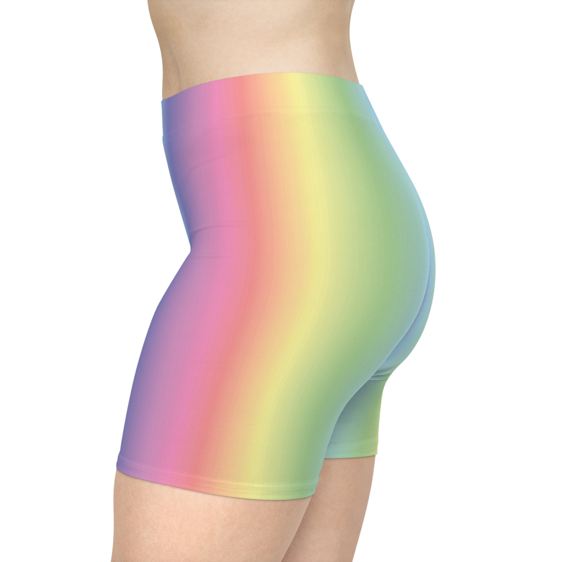 Nuestros shorts ciclistas Gentle Rainbow para mujer, súper cómodos y elásticos, son perfectos para tu atuendo del Orgullo, disfraces de payaso, yoga, entrenamiento o gimnasia. Hechos en EE. UU. con un colorido diseño degradado, estos shorts transmiten un toque divertido y alegre. Ideales para quienes disfrutan de estilos únicos y originales. Perfectos para disfraces de Halloween, fiestas temáticas del Orgullo o acrobacias.
