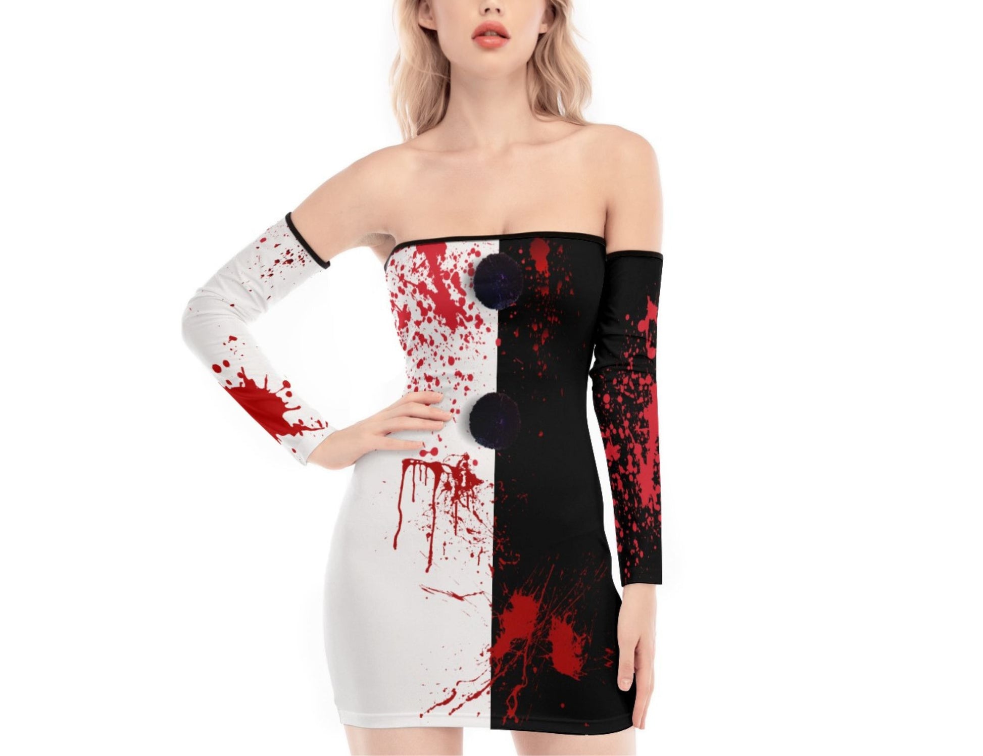 Terrifying Evil Clown Babe Bodycon Dress, Haunted House Horror Movie Art Halloween Costume Mini Tube Dress and Sleeves