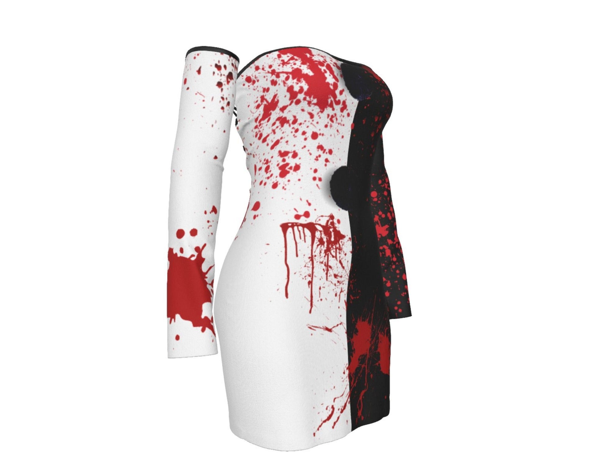 Sexy and horrifying get ready to haunt everyone's dreams when you wear this bodycon tube dress in split black and white, spattered in, um, red ink. Pom poms are printed on, so you don't have to worry about them snagging or falling off!