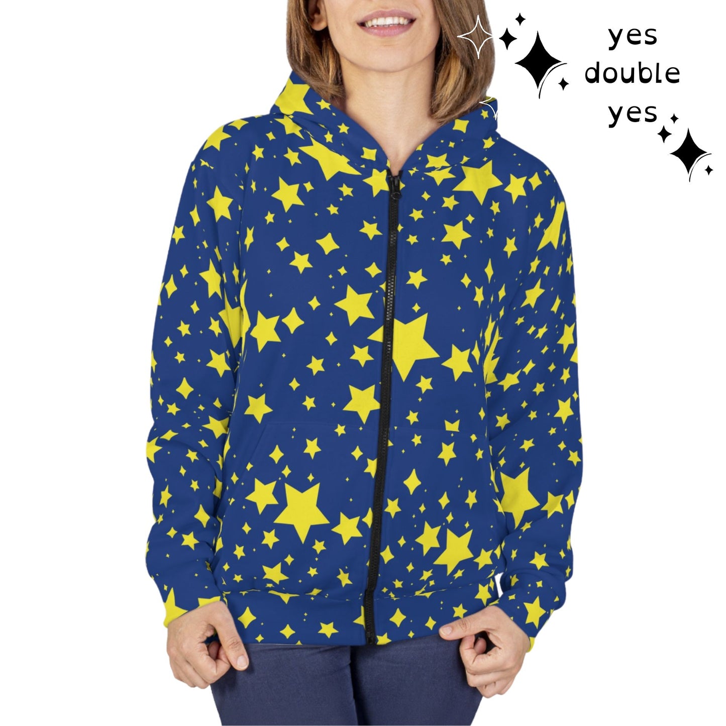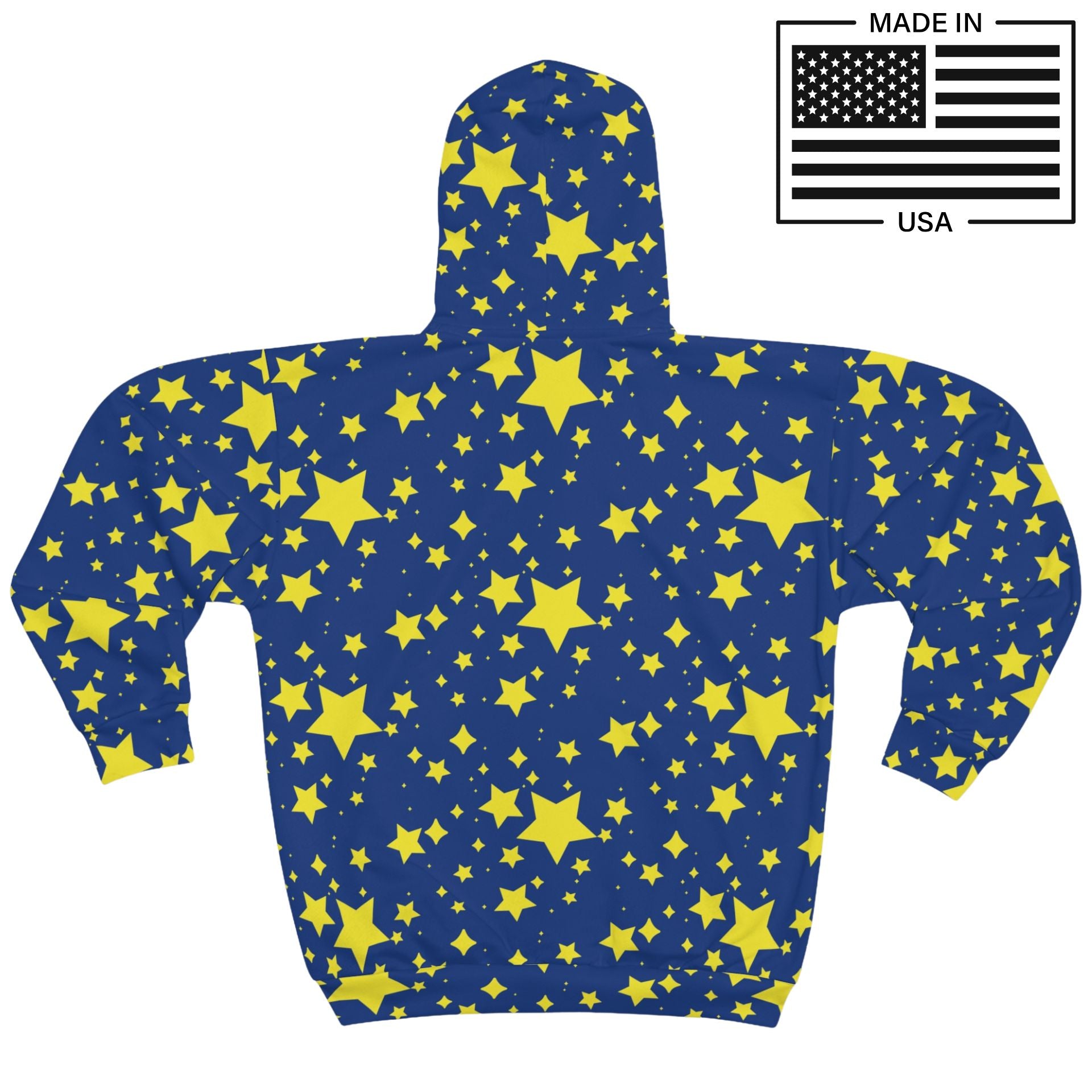 Magical cartoony kidcore style Wizard Robe Star Hoodie is nightsky blue and covered in magical golden stars! Our fun clowncore jacket sweatshirt has vibrant soft print on the outside, brushed polyester fleece inside--you'll never want to take off this cozy magic zip up hoodie! It has a large front pockets, black zipper, a roomy hood and is custom cut and sewn by a USA company based in North Carolina.