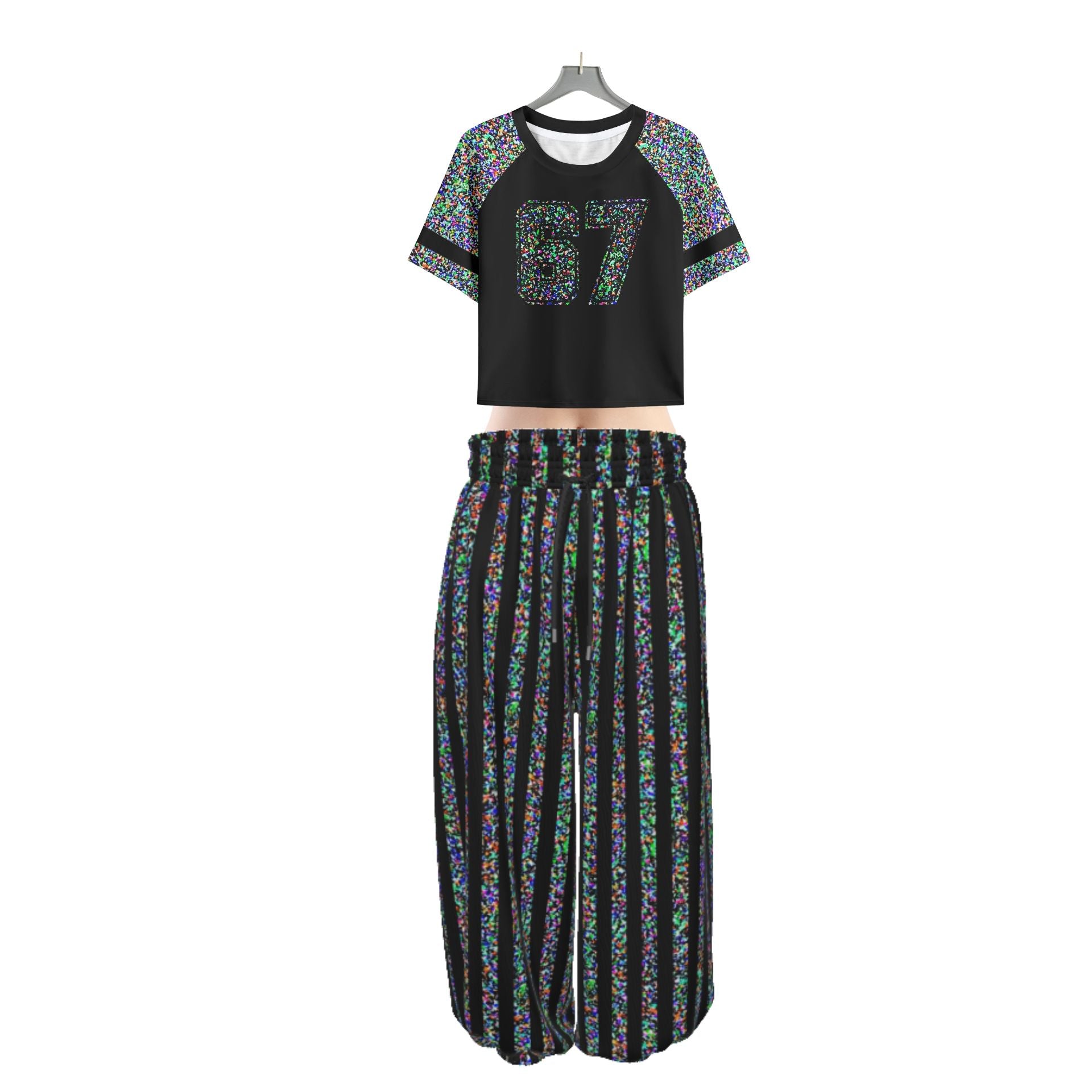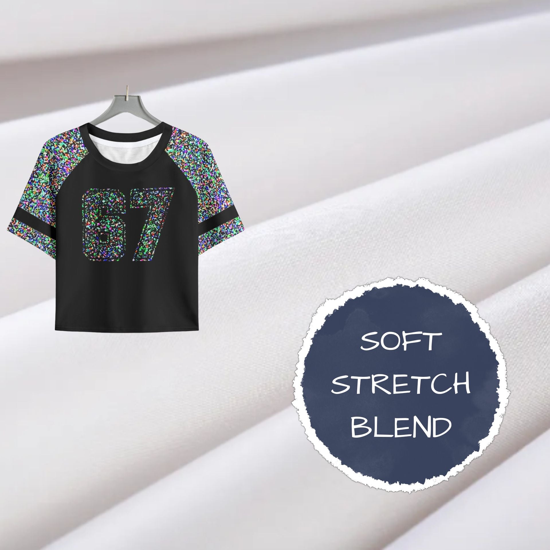 Breathable soft n' stretchy womens crop top with raglan sleeves and the numbers six seven in cool energy aura liminal static print! Women's sizes S-5XL