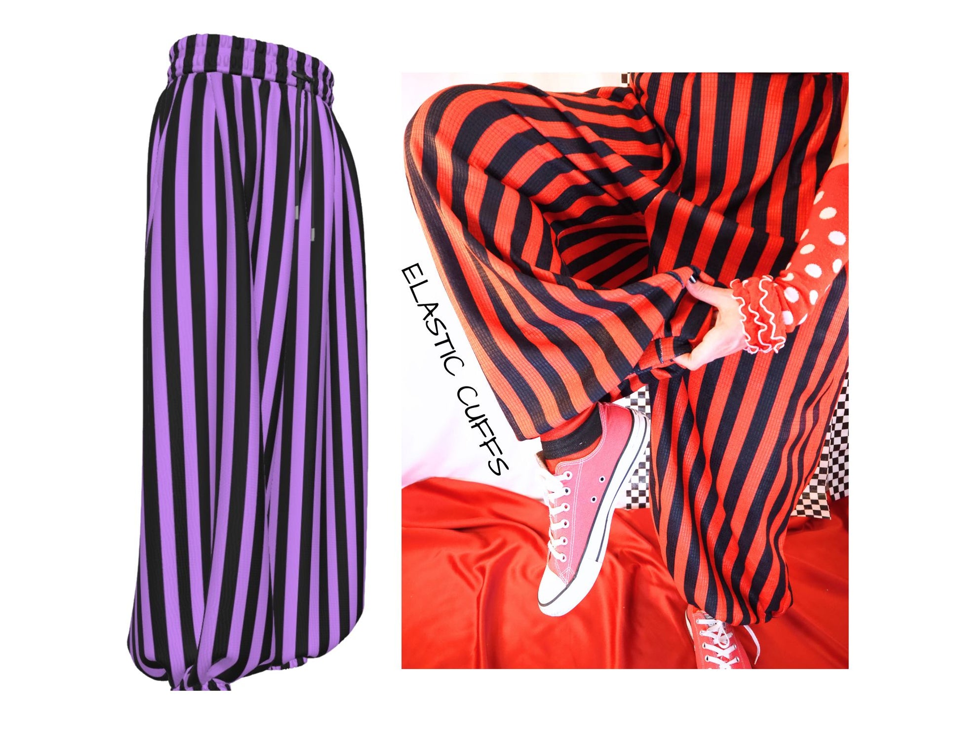 Pastel lilac purple and black striped clown pants will delight you and your audience while you clown in comfort--these are some of the balloony-est, softest, coziest pants you've ever had and you may just want to wear them all the time!