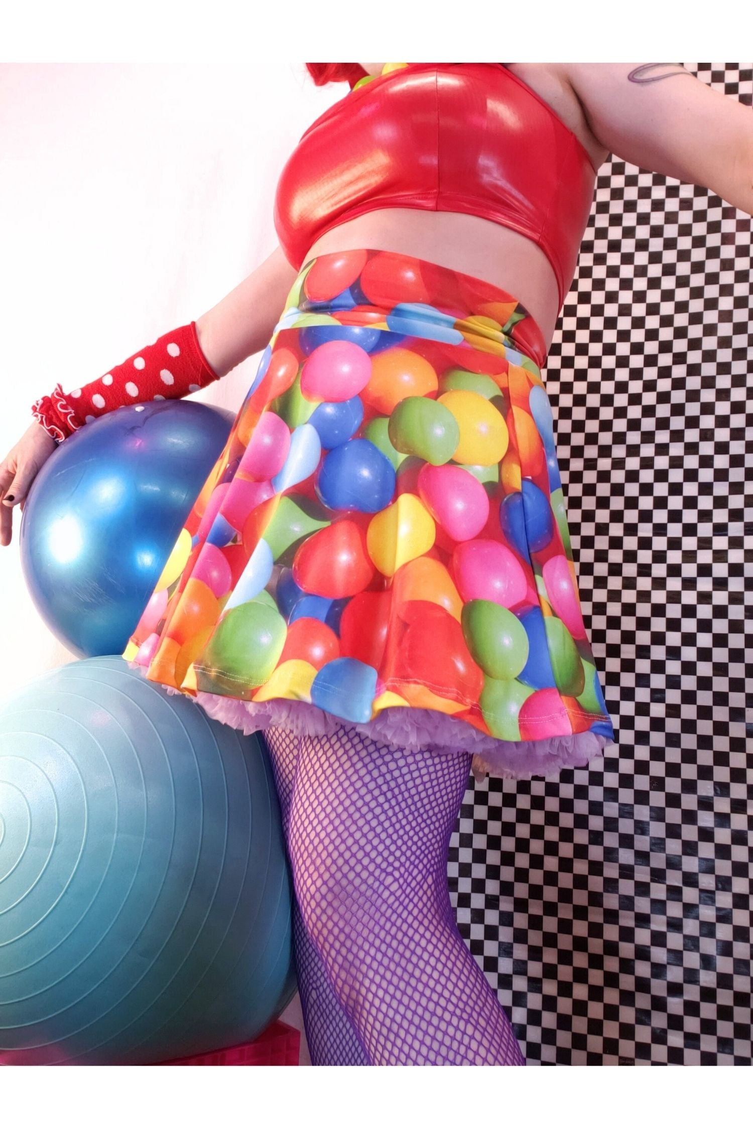 Like wearing a playground Rainbow! Rainbow kandi visual kei hi-rez ball pit balls print is all over this little juminocore circle skirt. Our cute Balloonatic decora kidcore skate skirt is made with a cozy, soft suede-like stretch fabric for a comfy maximalist decora kei look. Wide-elastic high waist short skirt looks great layered with a poofy tutu underneath or darling by itself as a summery breezy style.