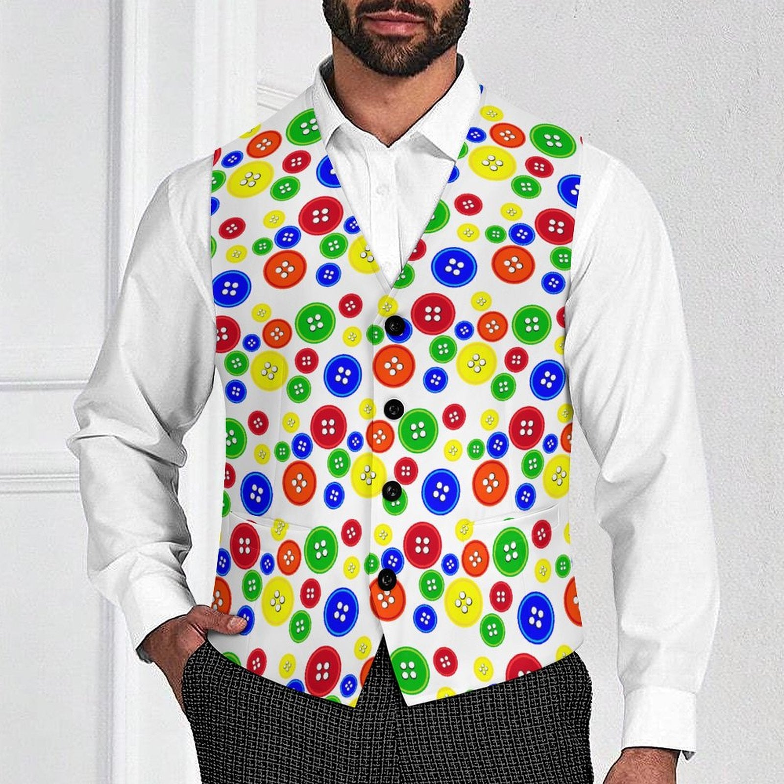 Funny big ol buttons silly clowncore print men's fancy clown waistcoat vest with 4 buttons and front pockets. Full printing on front and back! US men's sizes S-3XL