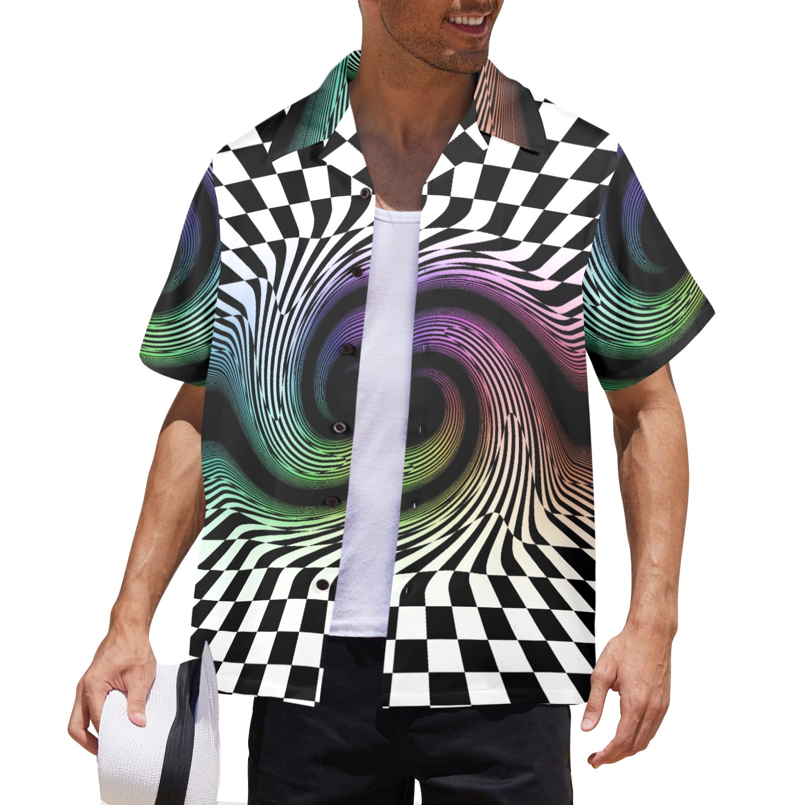 The perfect rave shirt, our dark rainbow portal swirl and checkerboard pattern Chromatrip Check Hawaiian shirt for men is a button up skate shirt with classic short sleeves, camp collar and casual boxy fit. Looks cool layered over your weirdcore outfits! The Y3K digital distortion art print strange bowling shirt will wow at raves, rooftop parties, gamer cons, and backyard BBQs! The easy-care fabric is silky and breathable with a slight stretch.