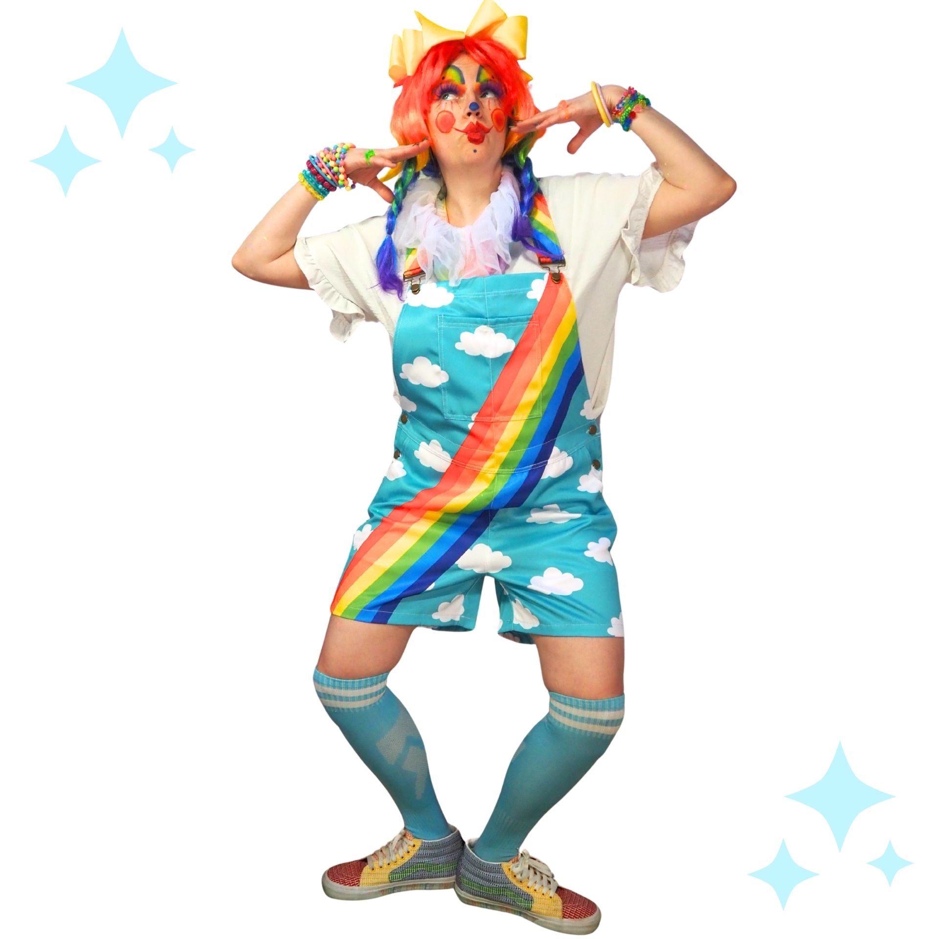 Fun and comfortable Clouds n Rainbow overall shorts made from sturdy polyester broadcloth are unisex sizing ranging from 2XS to 4XL--check the chart to get the right fit for your performance outfit or daily clowncore style!!