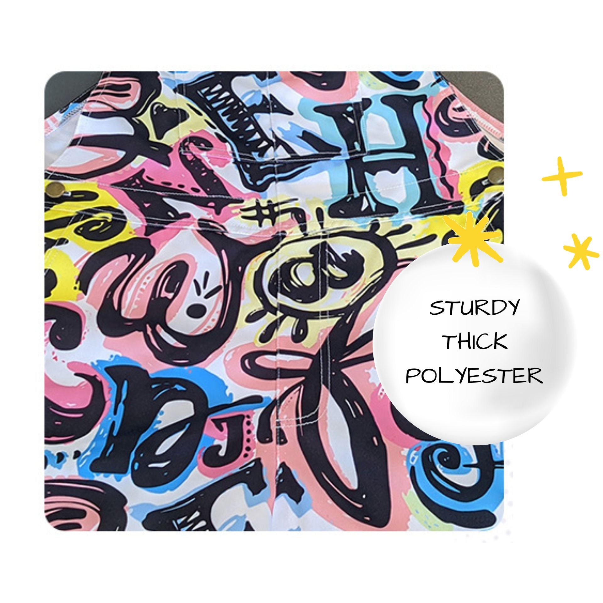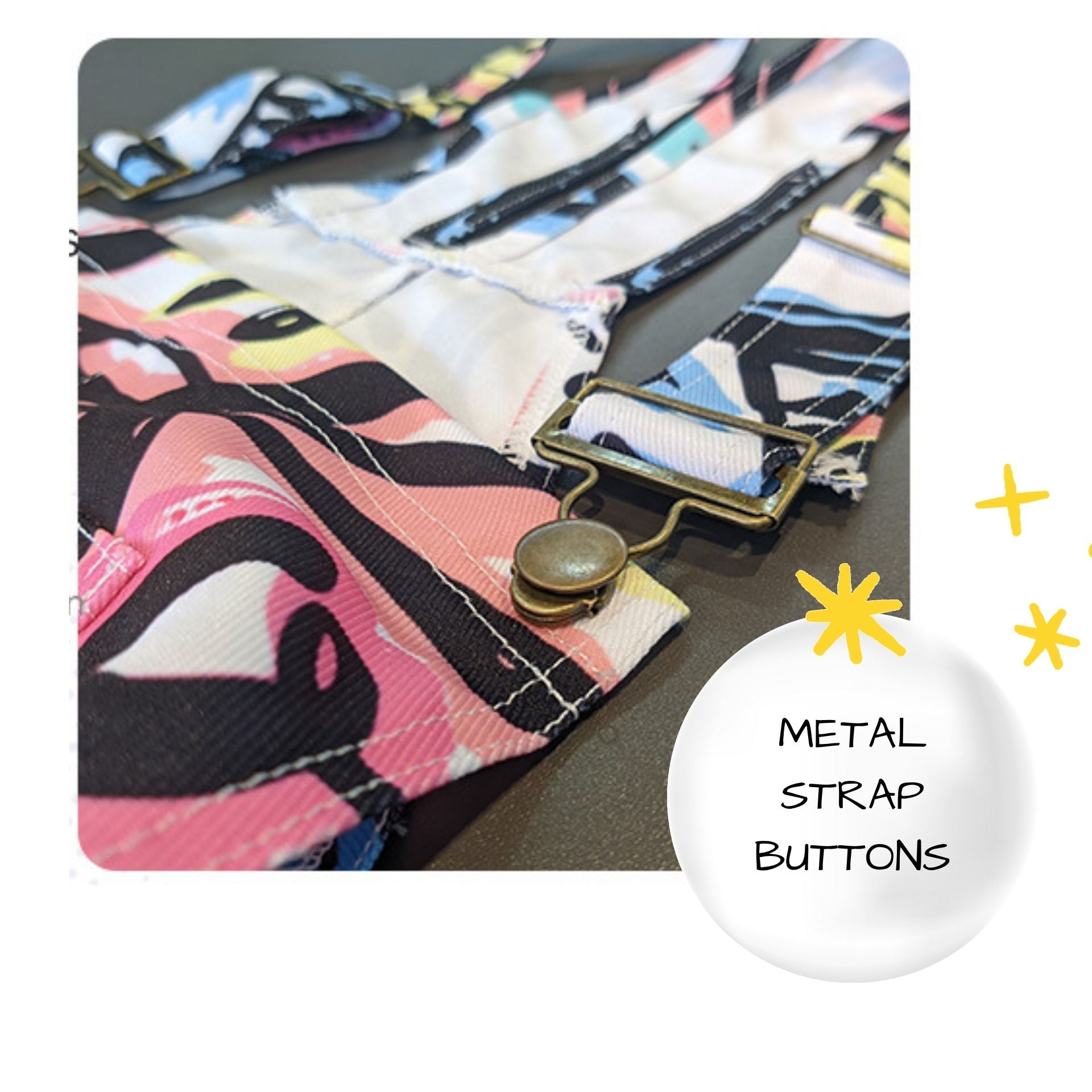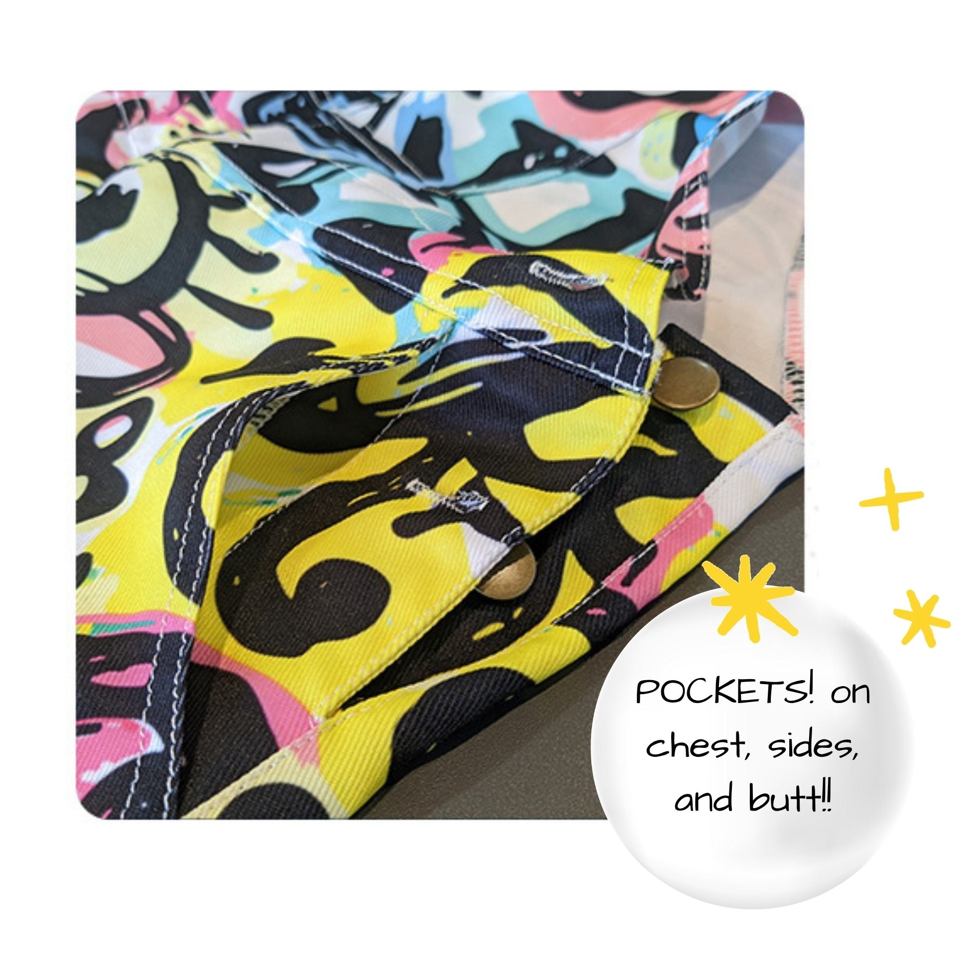 Features: Pockets on chest, sides, and back! Adjustable straps with metal buttons. Soft sublimation printing will never crack or peel, and will stay vibrant a very long time.