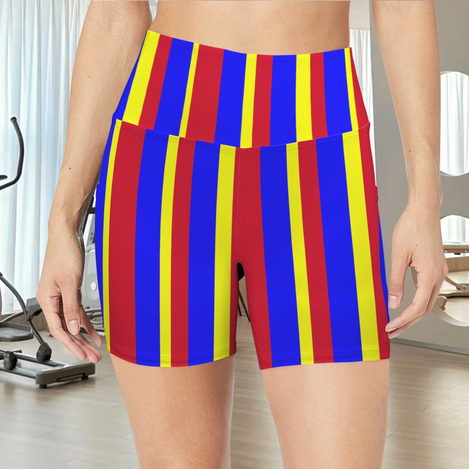 Primary color striped stretchy womens bike shorts with pockets! Perfect as a modesty layer in clowning costumes and performances, plus a great way to keep your cell phone and keys close at the gym or con! Nice wide high waistband won't pinch you while you are dancing, clowning and working out. Womens plus sizes up to 5XL available!