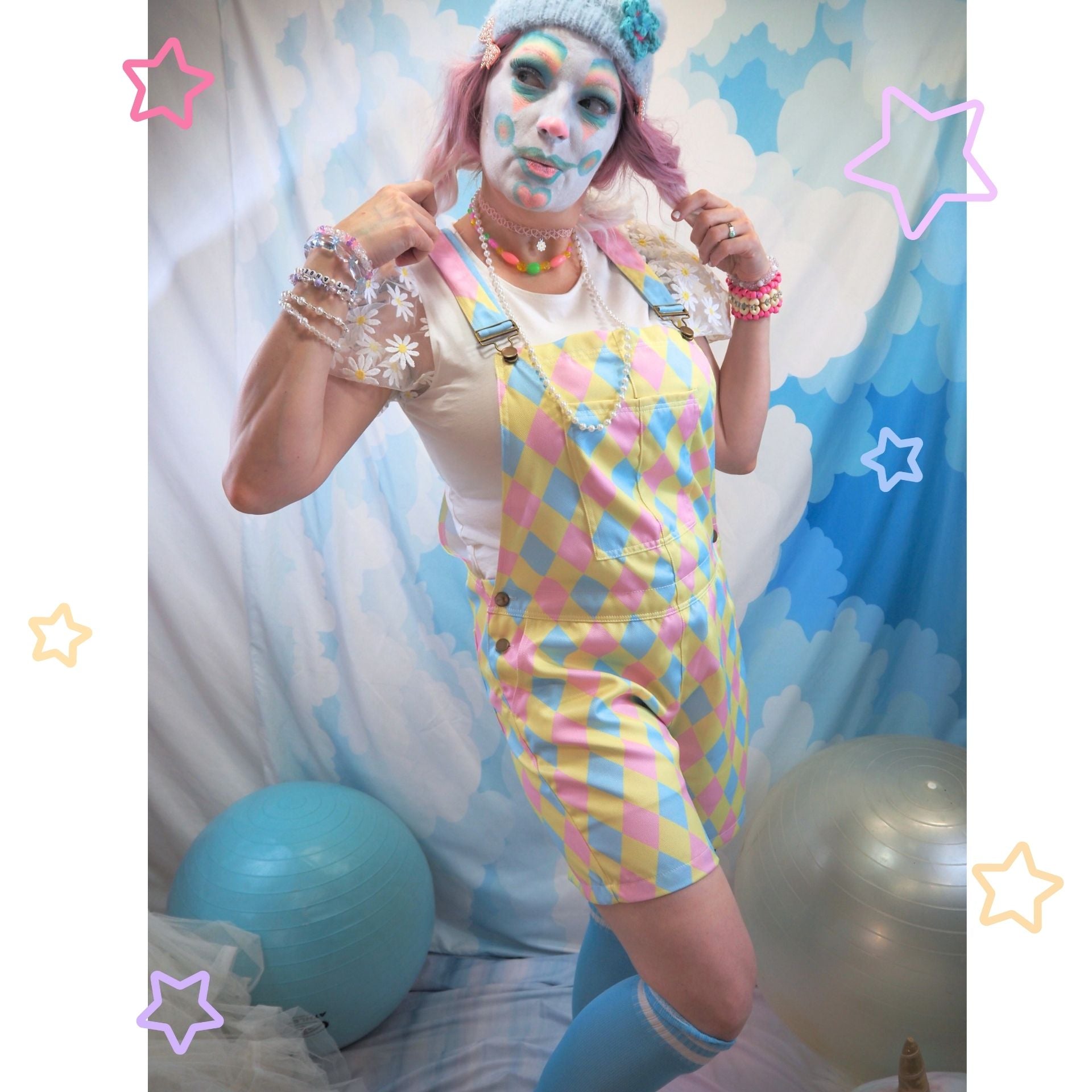 Fun and comfortable pastel red blue and yellow clowncore harlequin diamond pastel overalls shorts made from sturdy polyester broadcloth are unisex sizing ranging from 2XS to 4XL--check the chart to get the right fit for your performance or daily clowncore style!!