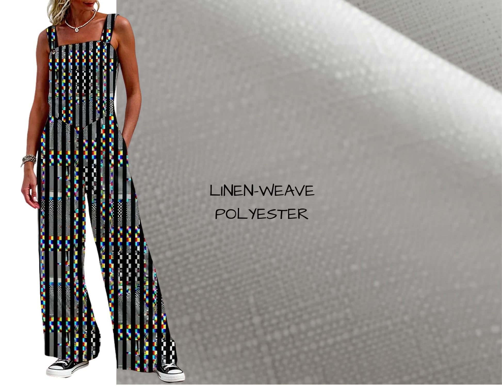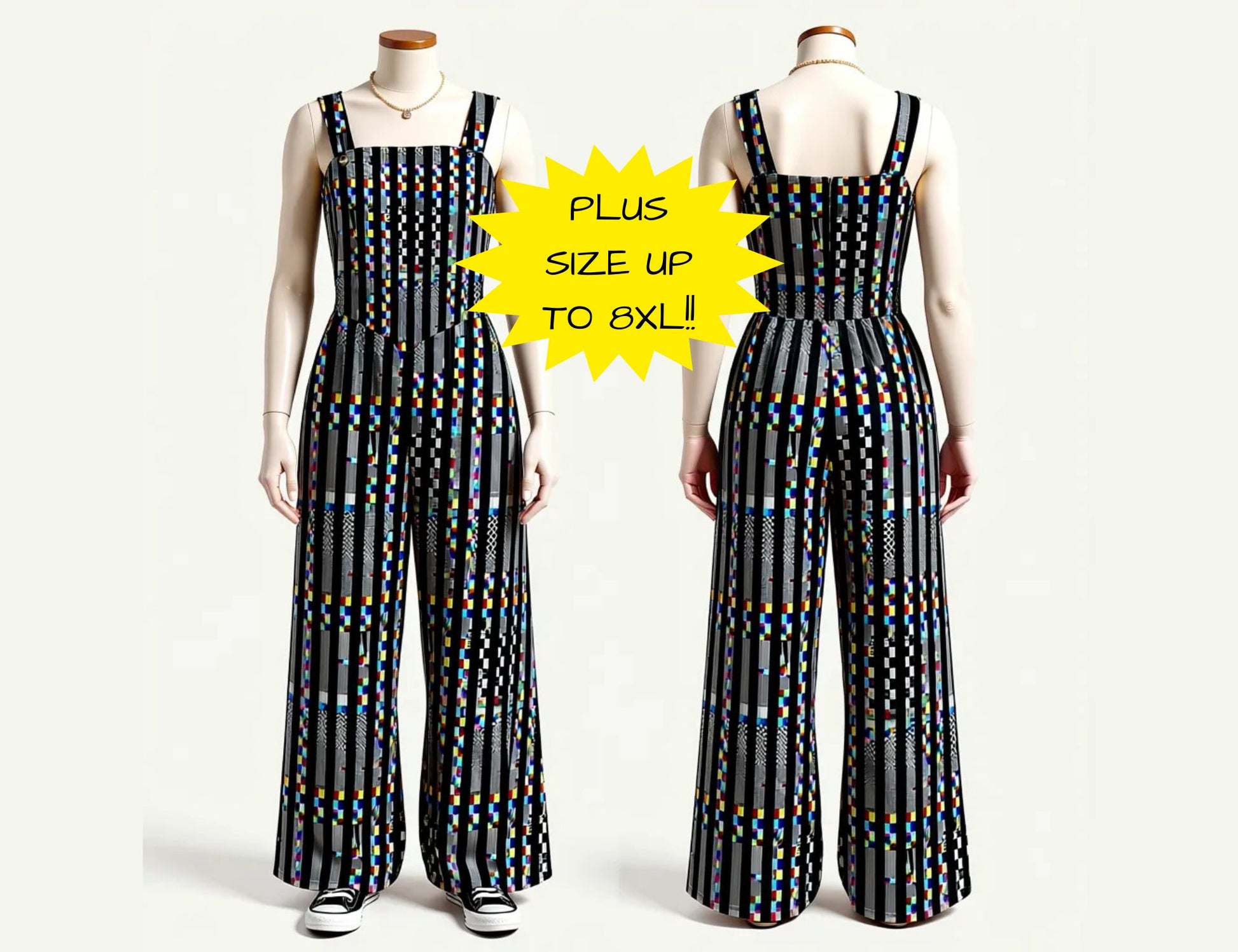 Wide-leg palazzo pants-style overalls with a weirdcore cyberpunk distorto-glitch stripe pattern. Side pockets, adjustable straps, and linen-esque textured polyester material that is wrinkle-resistant. Plus size up to 8XL available!!!