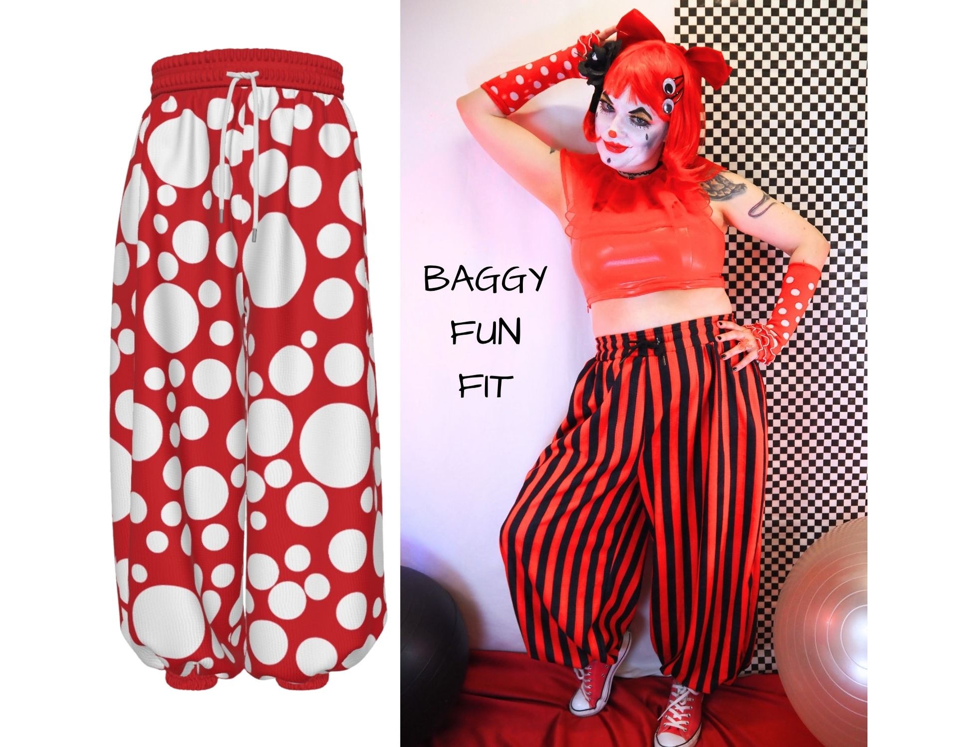 abysPerfect gnome home style red and white mushroom pokadot print will delight you and your audience while you clown, cosplay, or lounge in comfort--these are some of the balloony-est, softest, coziest pants you've ever had and you may just want to wear them all the time!