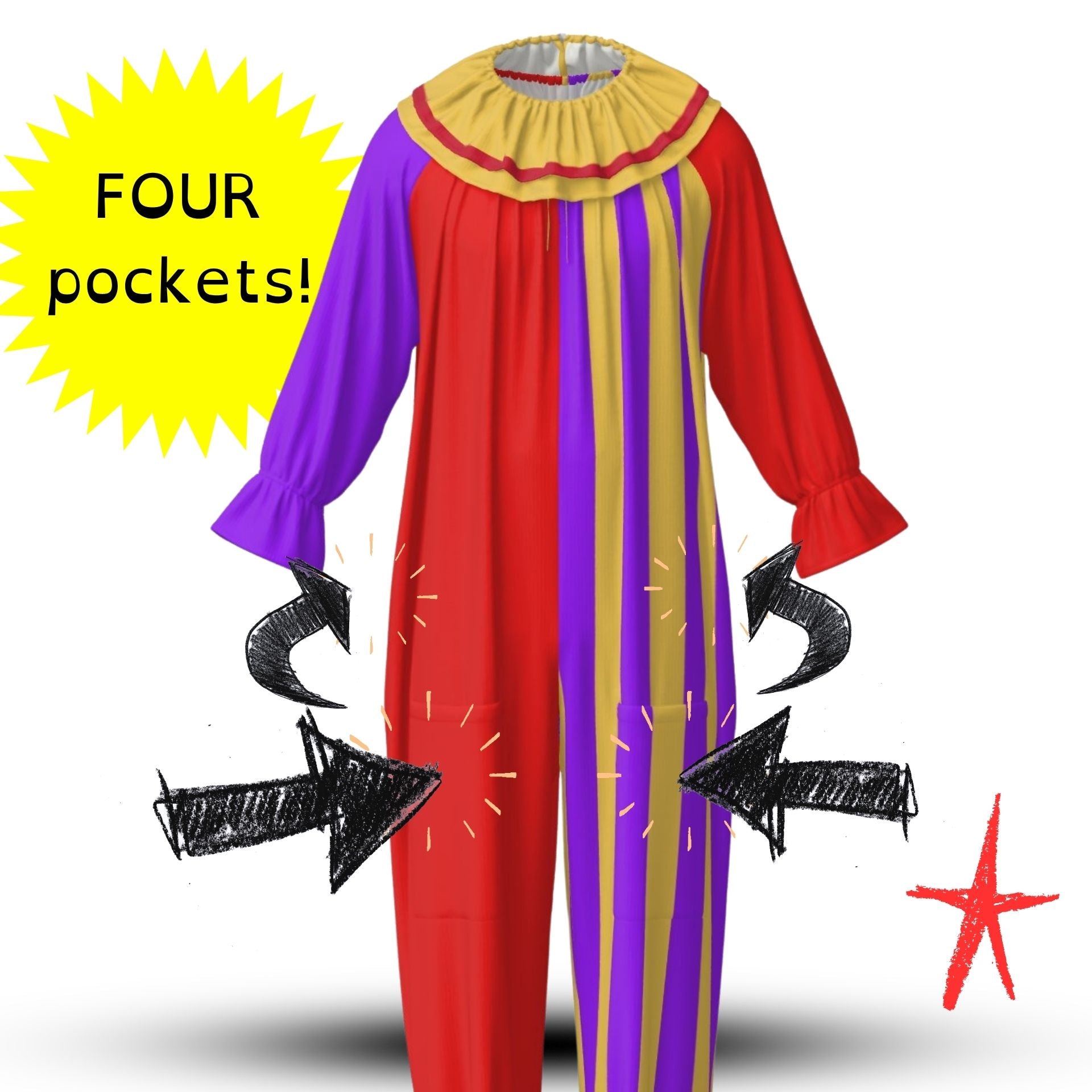 Finally a full, poofy suit for working clowns!! This AbyssWares exclusive suit features an easy step-in design with a front tie opening, side pockets AND front patch pockets big enough for a balloon pump! The cuffs and hems have elastic gathered self-ruffles, and it includes the 2-tier detached adjustable ruffle collar to complete the looq.