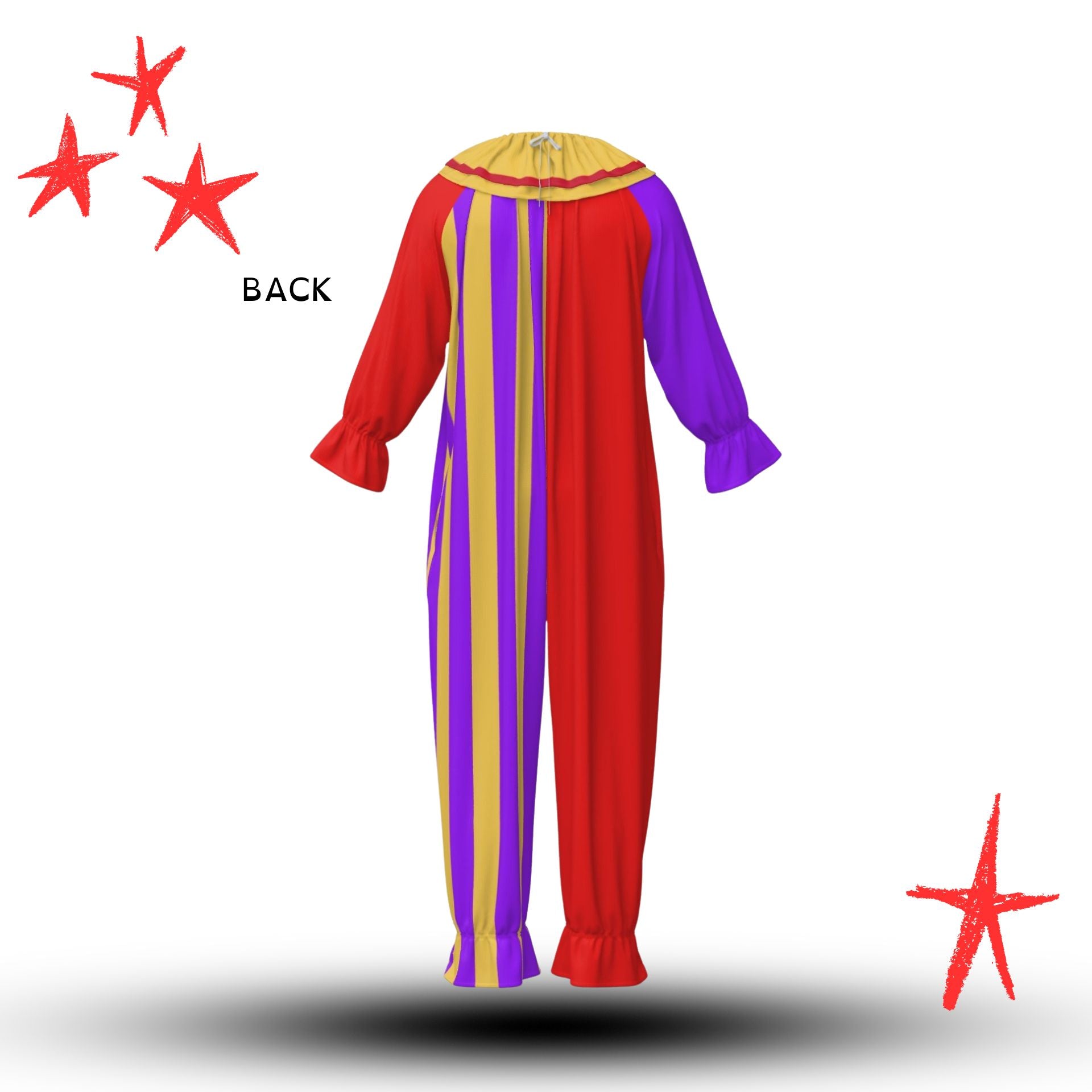 This fabulously baggy clown suit suit and ruff collar set is made from durable, non-stretch fabric that maintains its shape through countless performances. Perfect for theatrical productions, cosplay, parades, birthday parties, professional entertainers, costume events, or themed celebrations.