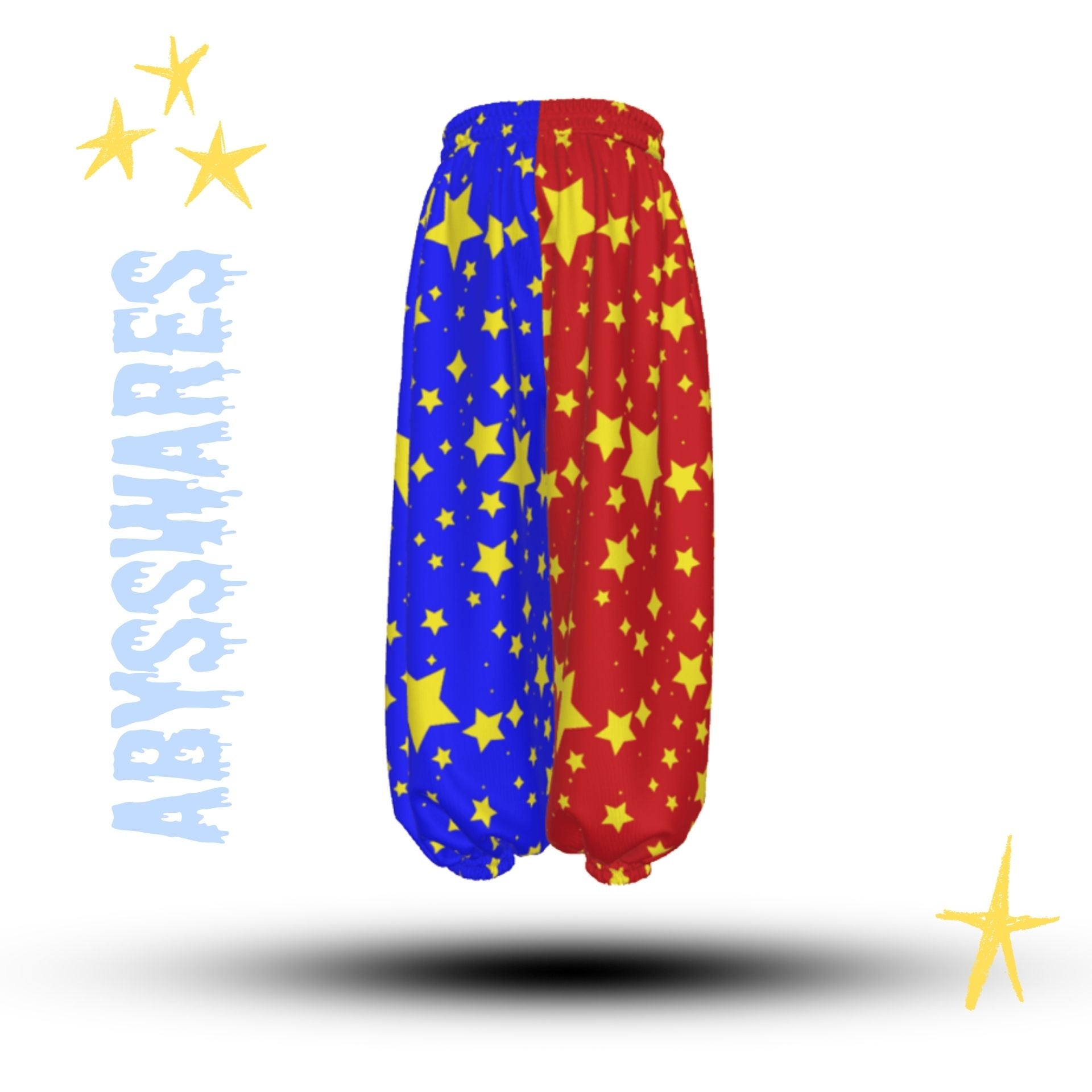 Great for a clown costume or just a Friday night at home lounging in comfort! These baggy red blue and yellow primary color oversized starry print pantaloons will delight you and your audience while you clown or cosplay in comfort--you may want to wear them all the time, These are some of the balloony-est, softest, coziest pants you've ever had! Nice side pockets, and elastic at waist and ankles make these extra comfy and convenient.