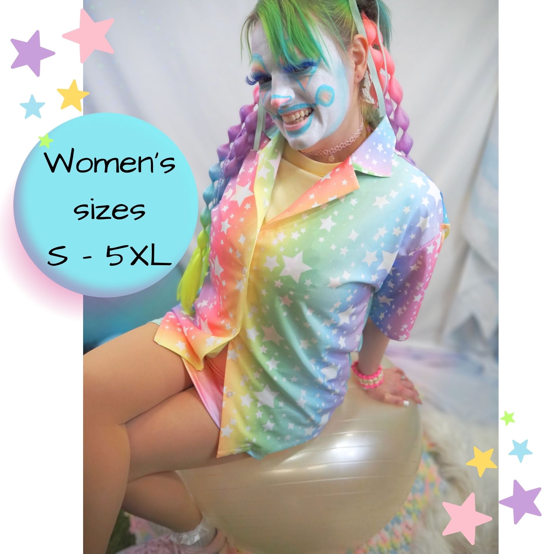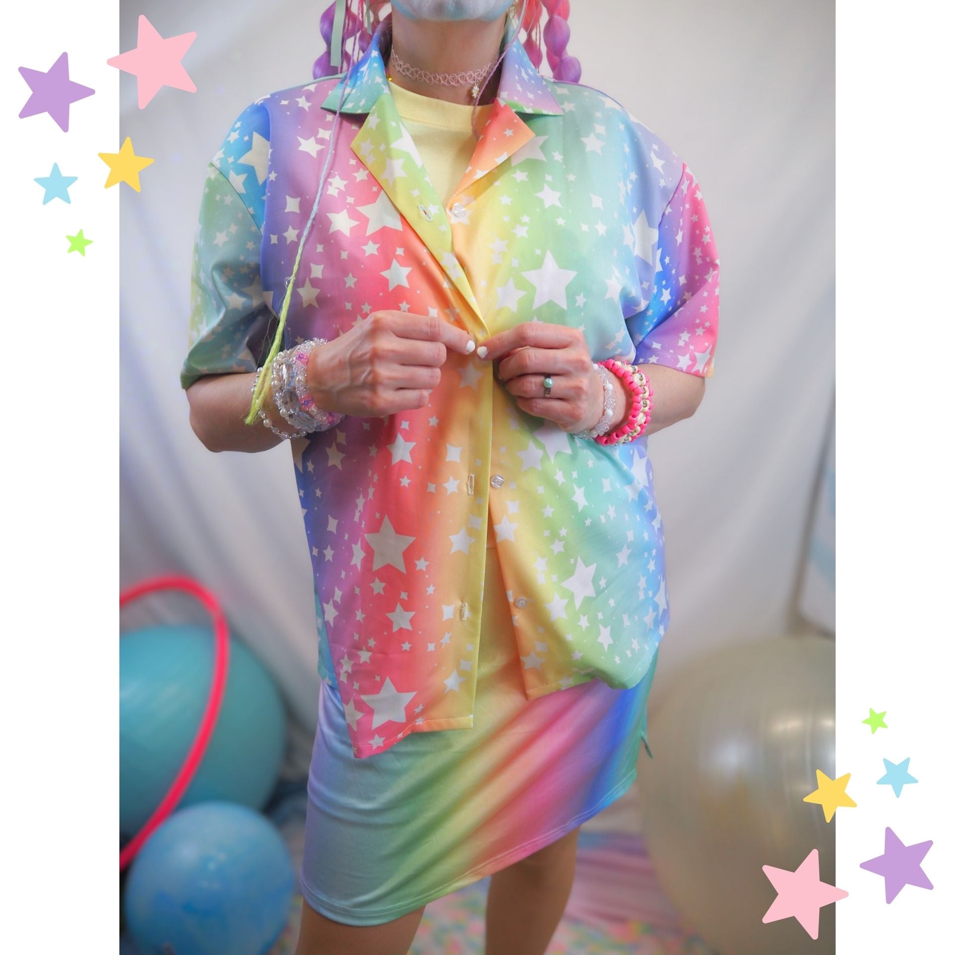 So happy cutecore sweet! Our Rainbow Stardust Button Up Blouse is great layered over decora kei fairy kei outfits for a maximalist look, great for a cute Halloween clown costume, or great by itself as a statement Hawaiian shirt your can wear to the beach, pool parties, backyard BBQ, and everyday! Light breathable poly-spandex blend fabric feels cool and silky, with a loose comfort fit. Plus size up to 5XL available, and sizes run large!! Please check out size guide for your very best fit. Made in the USA!