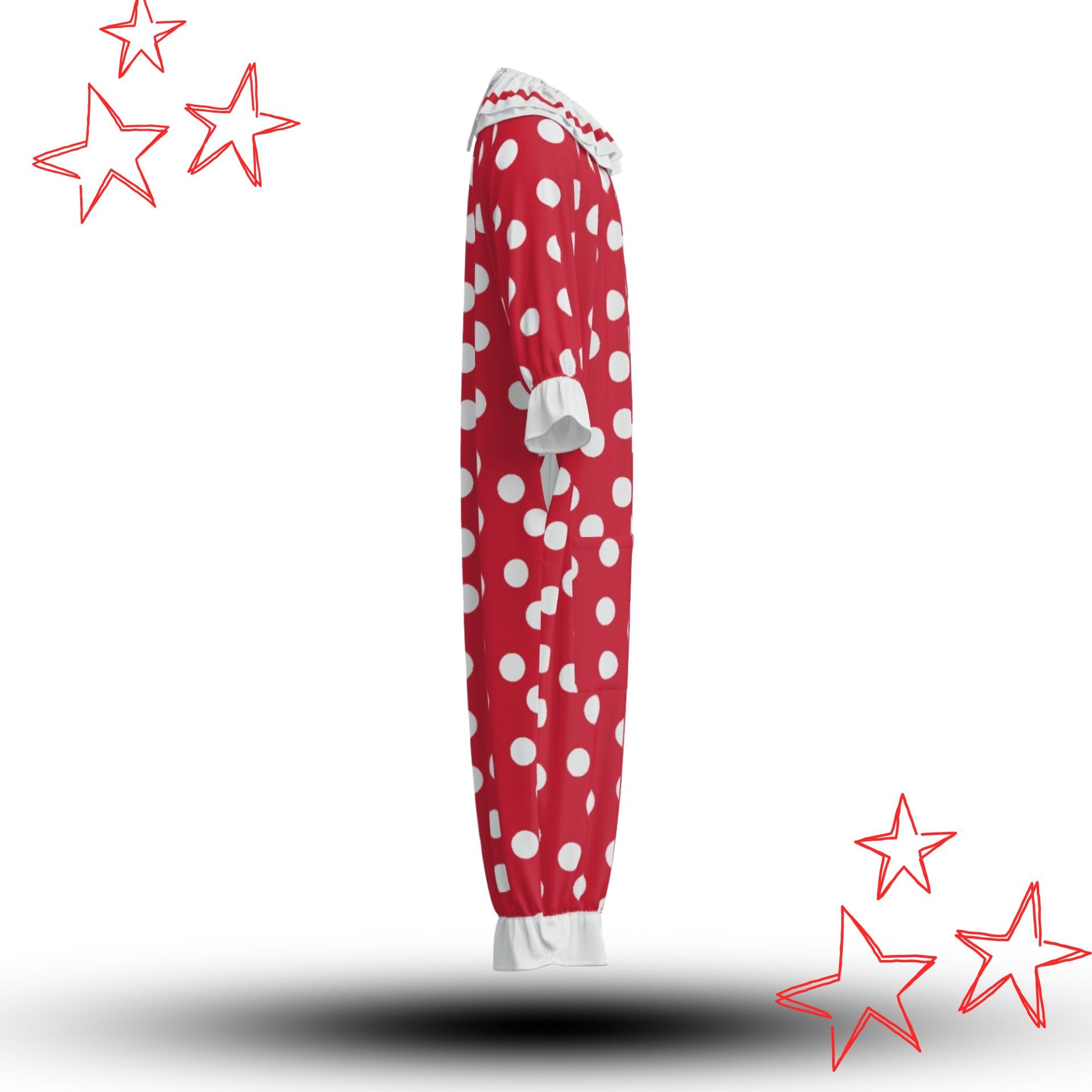 In clowny bright red with big white polka dots, this is a full coveralls poofy suit outfit for working clowns!! This AbyssWares exclusive suit features an easy step-in design with a front tie opening, side pockets AND front patch pockets big enough for a balloon pump! The cuffs and hems have elastic gathered self-ruffles, and it includes the 2-tier detached adjustable ruffle collar to complete the looq.