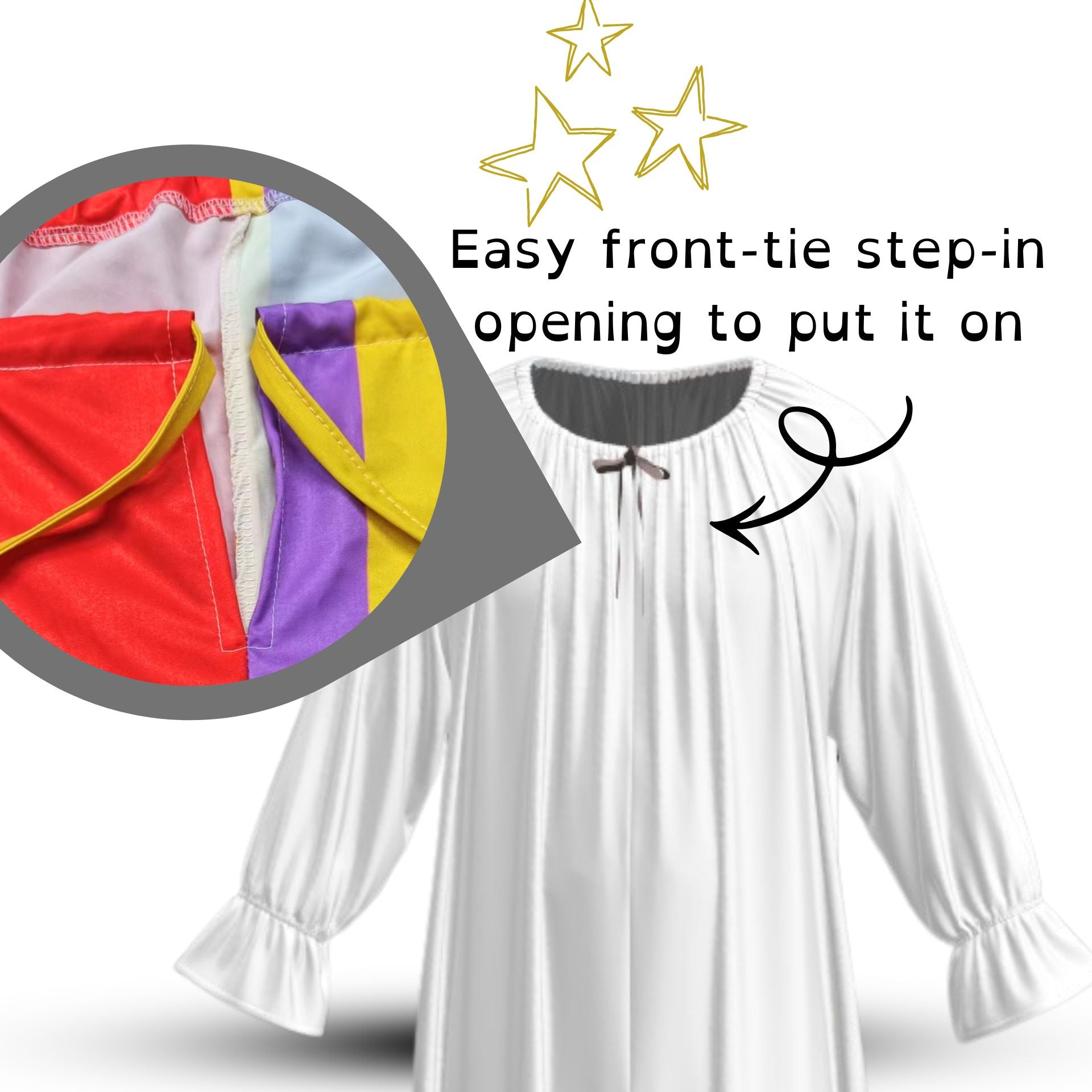 --Features: step-in drawstring neck opening, 4 pockets total, elastic cuffs and hems, detached adjustable 2-tier ruffle collar