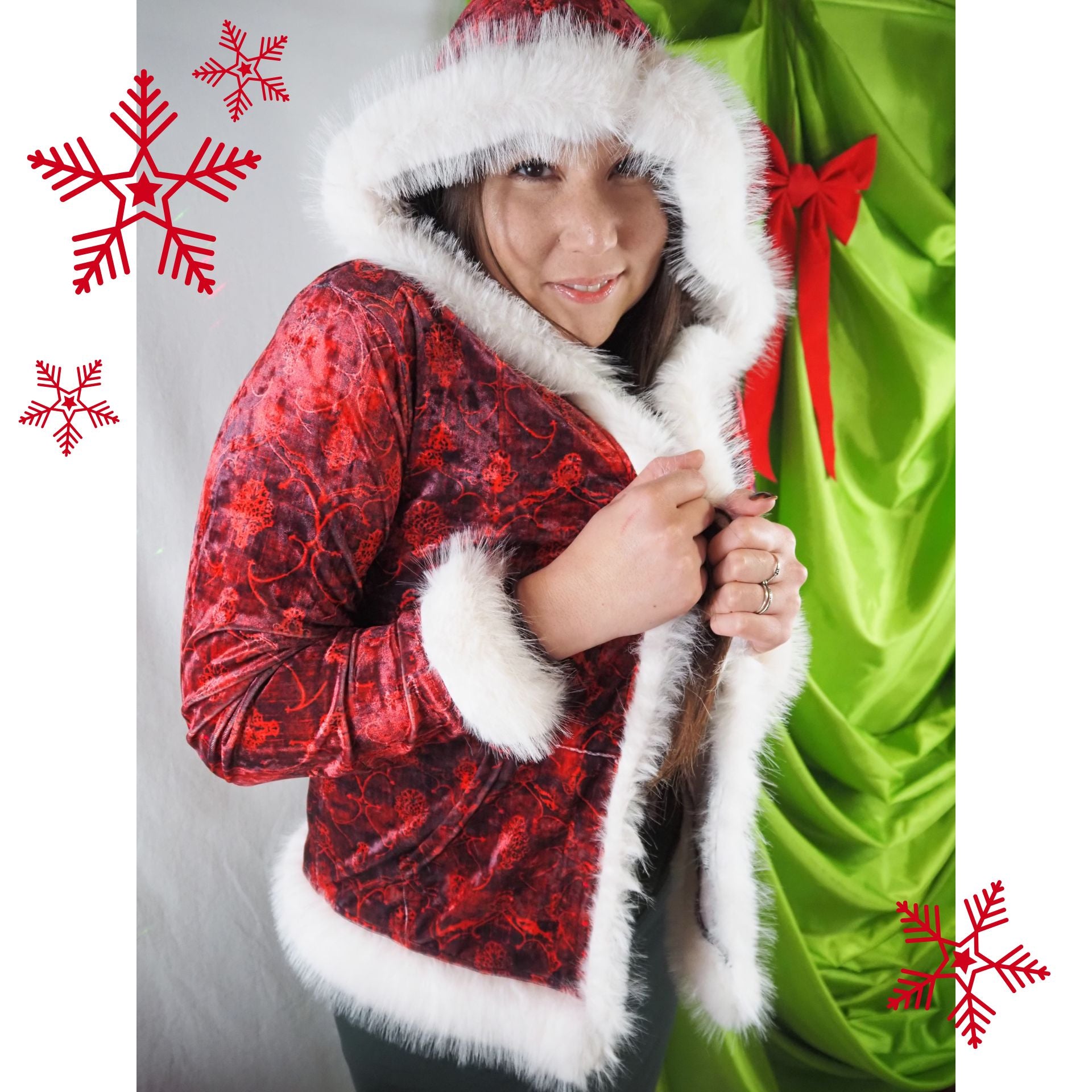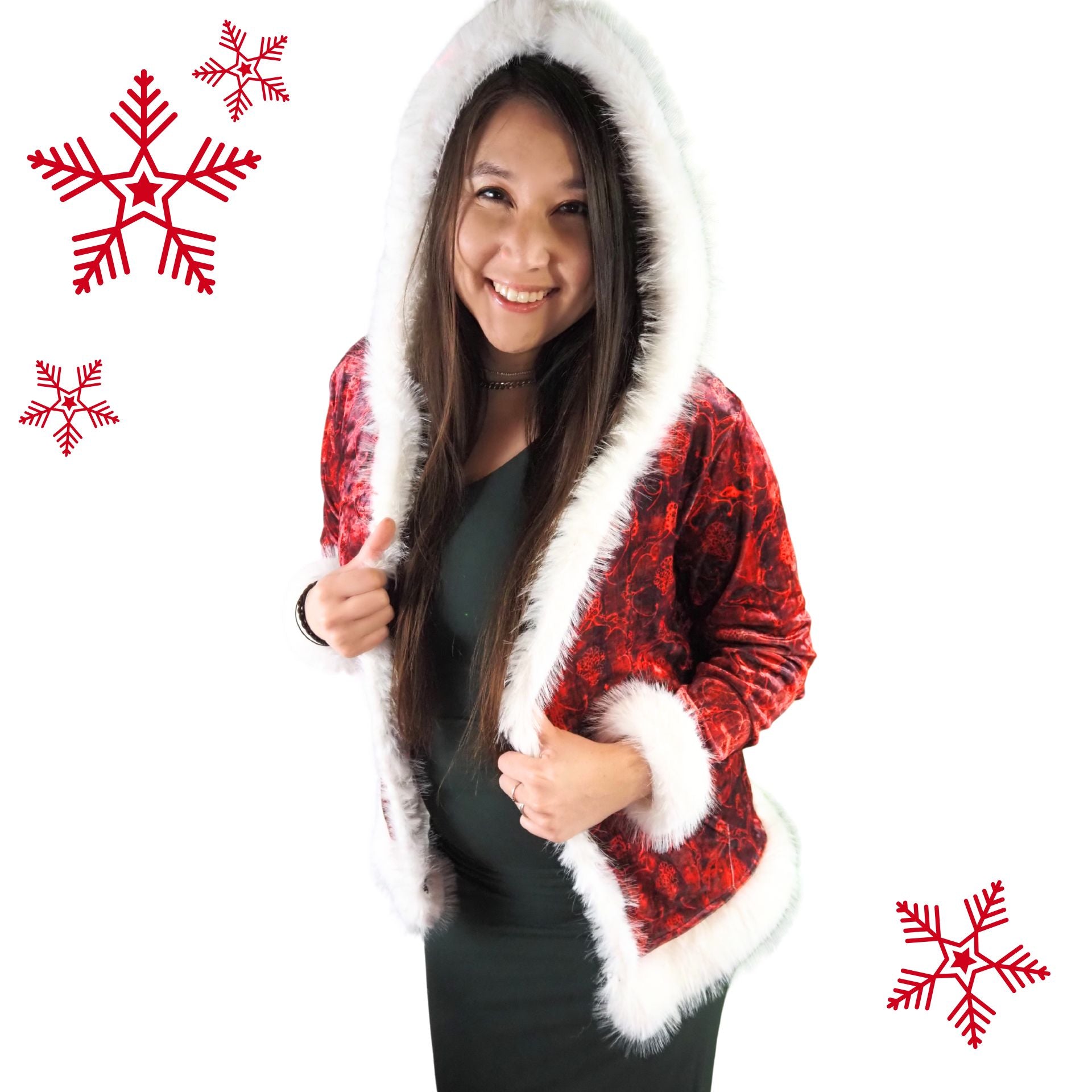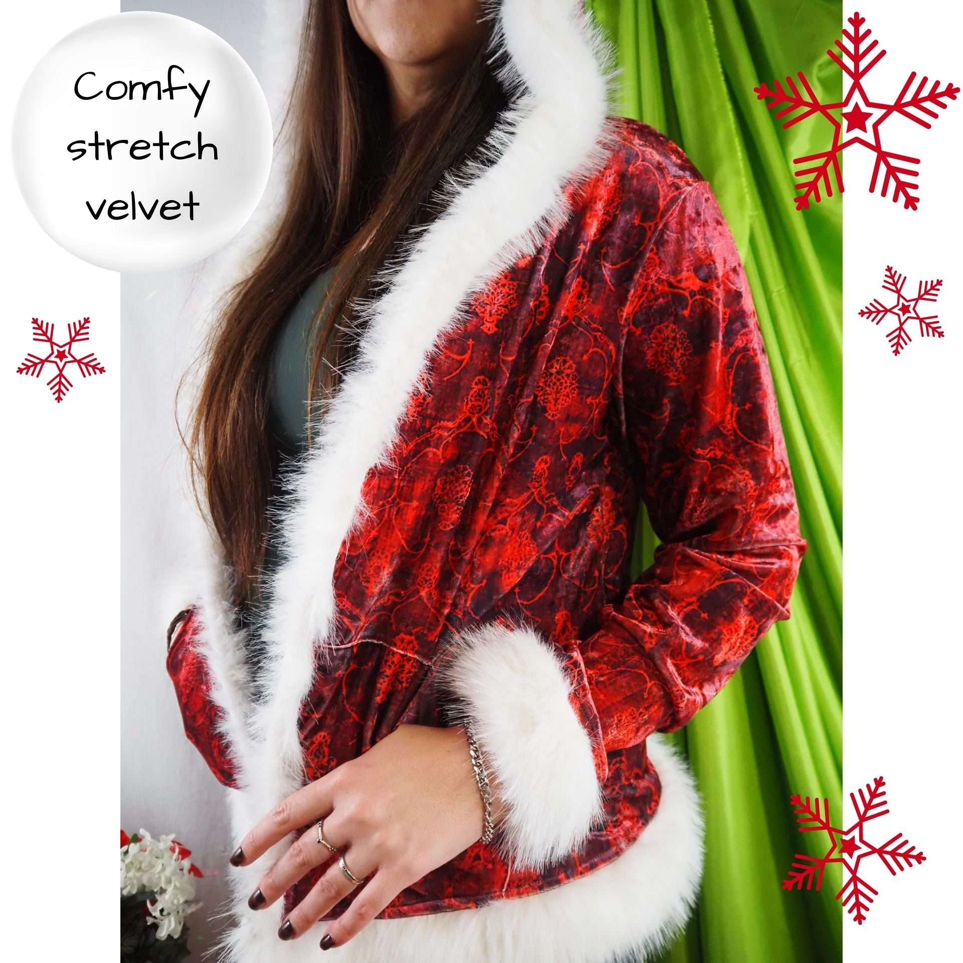 Red shimmer velvet cloak-style pull-on hoodie in a gorgeous detailed vintage Victorian damask print. Lightweight stretch velvet is great for layering, and not too hot for performing at indoor winter holiday events! Pair with our matching dress for an elegant Mrs. Clause costume.