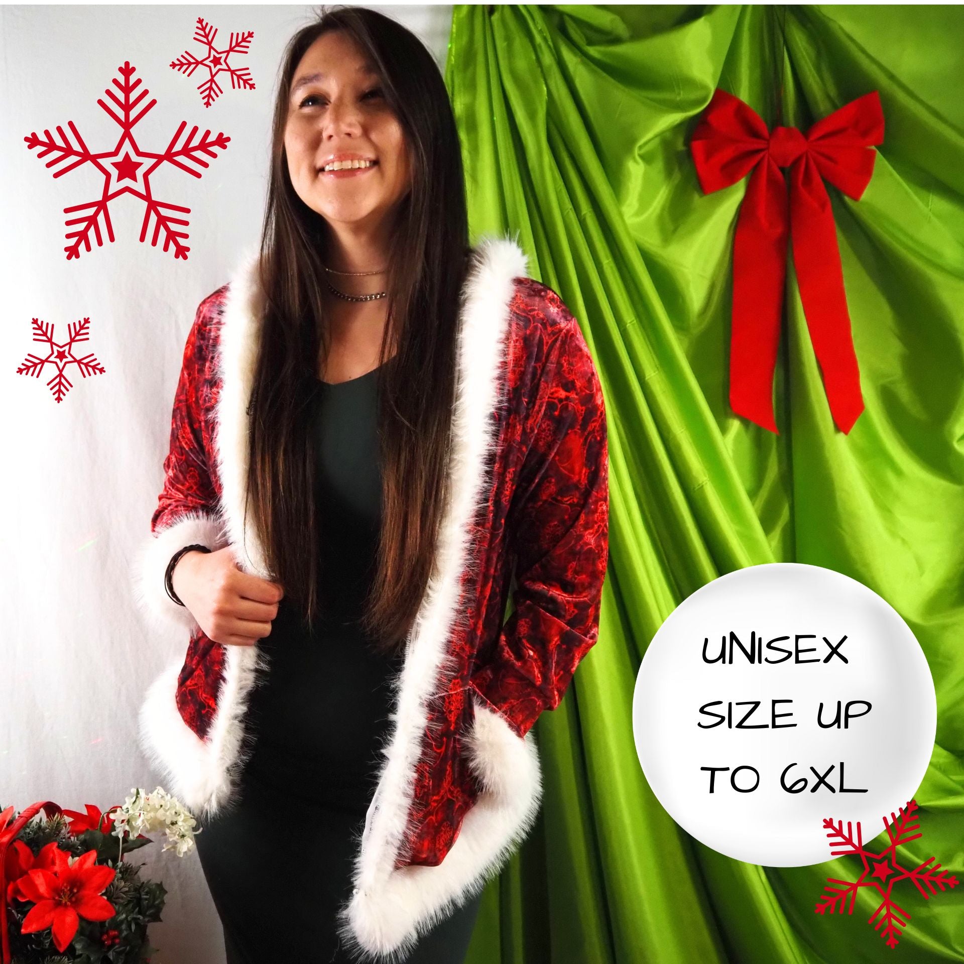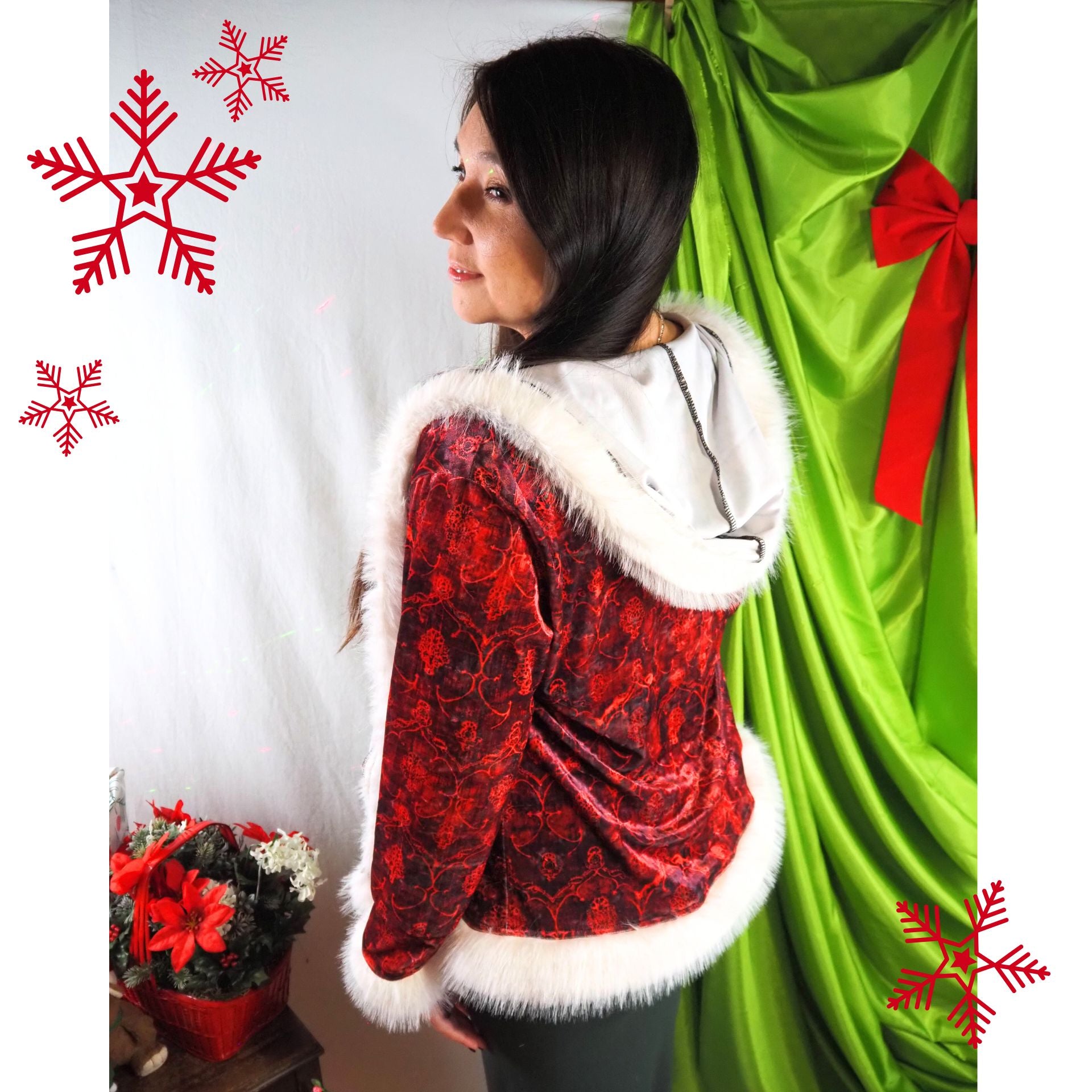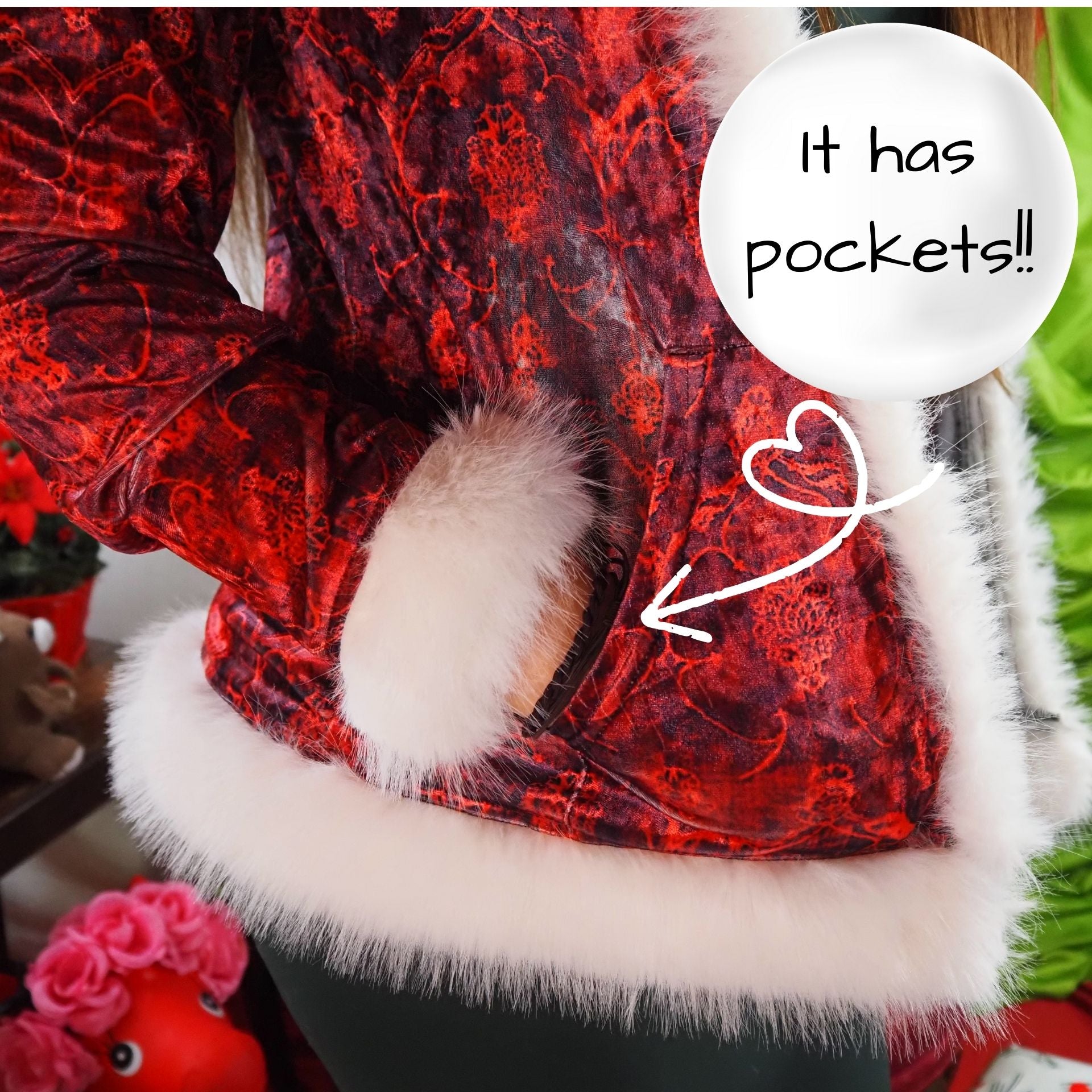 Red shimmer velvet cloak-style pull-on hoodie in a gorgeous detailed vintage Victorian damask print. Lightweight stretch velvet is great for layering, and not too hot for performing at indoor winter holiday events! Pair with our matching dress for an elegant Mrs. Clause costume.
