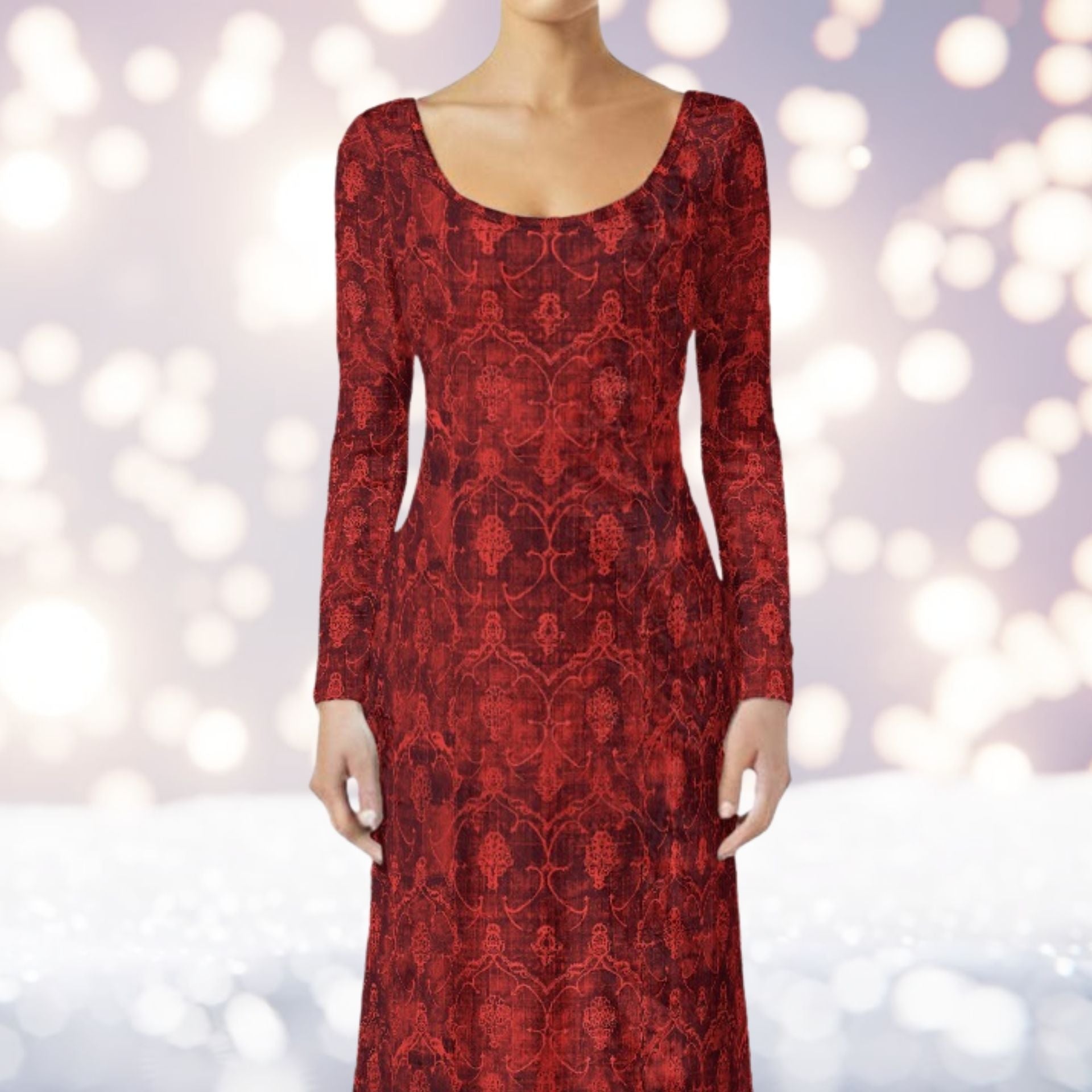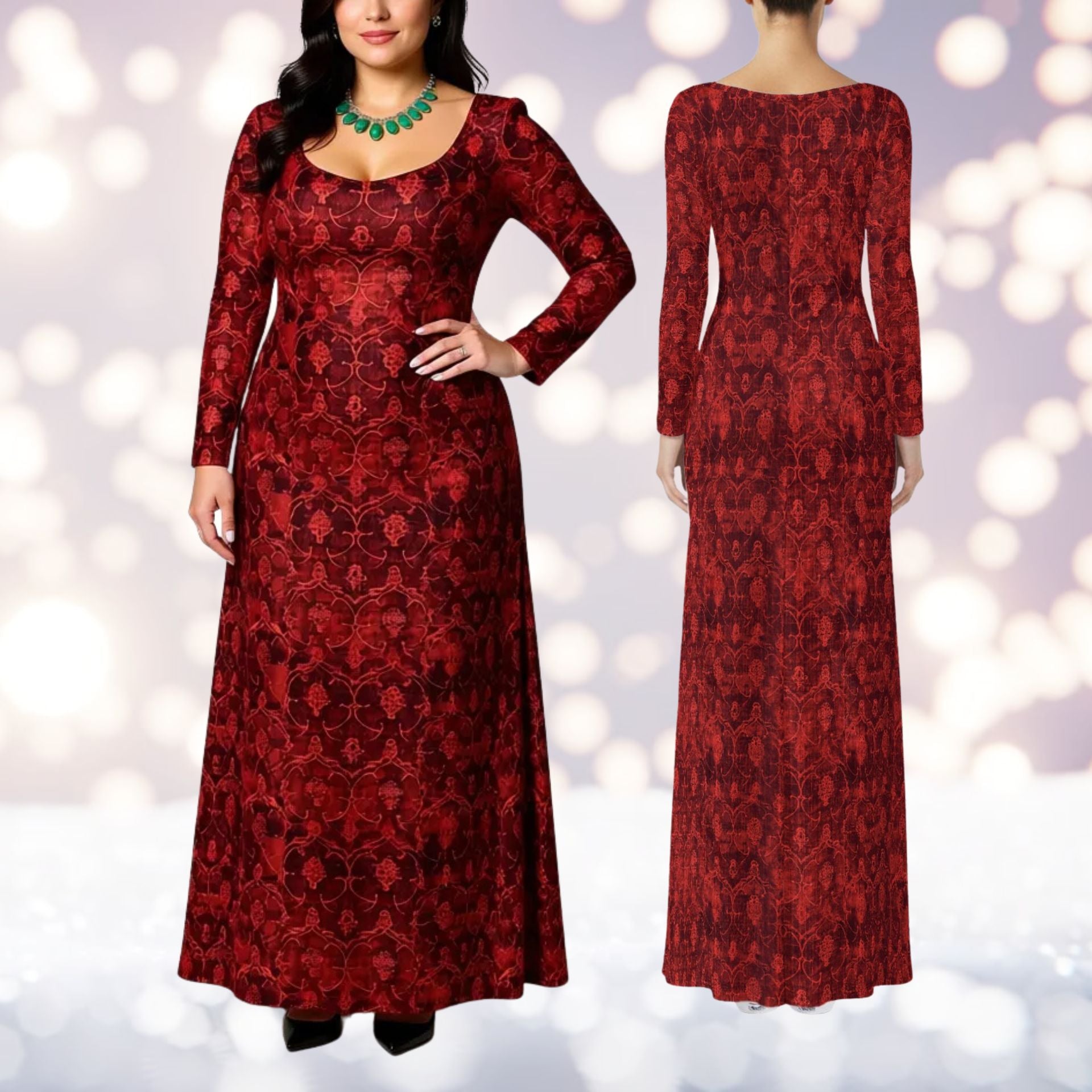Fit for a queen! Regal floor-length red stretch velvet winter gown with a vintage Victorian floral damask pattern. Long slender sleeves, scoop neck and sweeping skirt make this a stunning holiday party dress or an elegant Mrs. Clause!