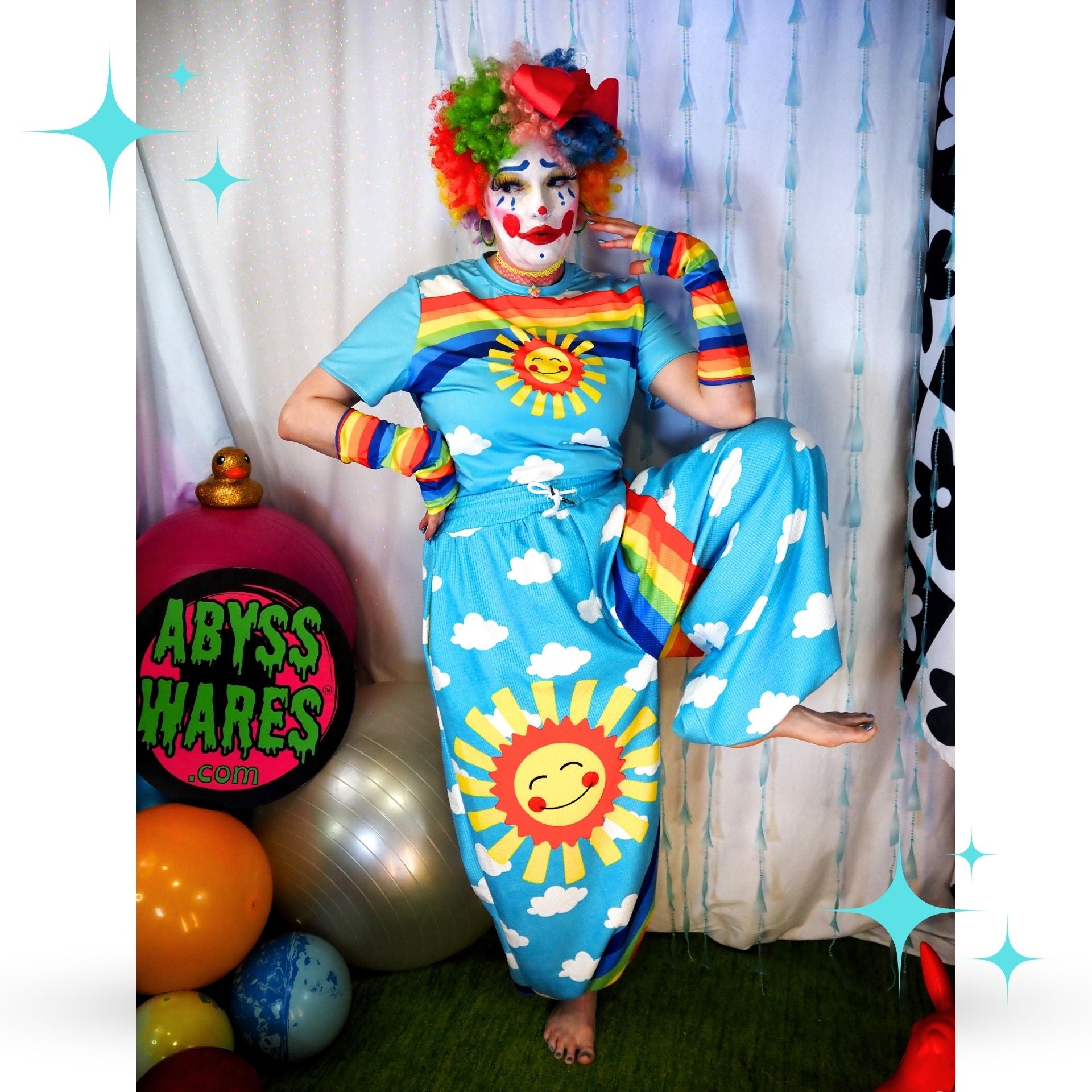 Silly Sun Clouds n Rainbow Stripe Clown Pants
