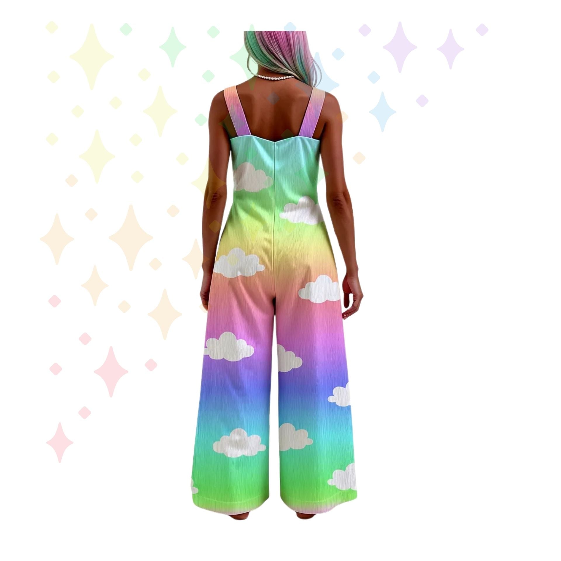 Wide-leg palazzo pants-style overalls with a dreamy sweet pastel rainbow gradient and kawaii cute clouds pattern. Side pockets, adjustable straps, and linen-esque textured polyester material that is breathable and wrinkle-resistant. Plus size up to 8XL available!!!