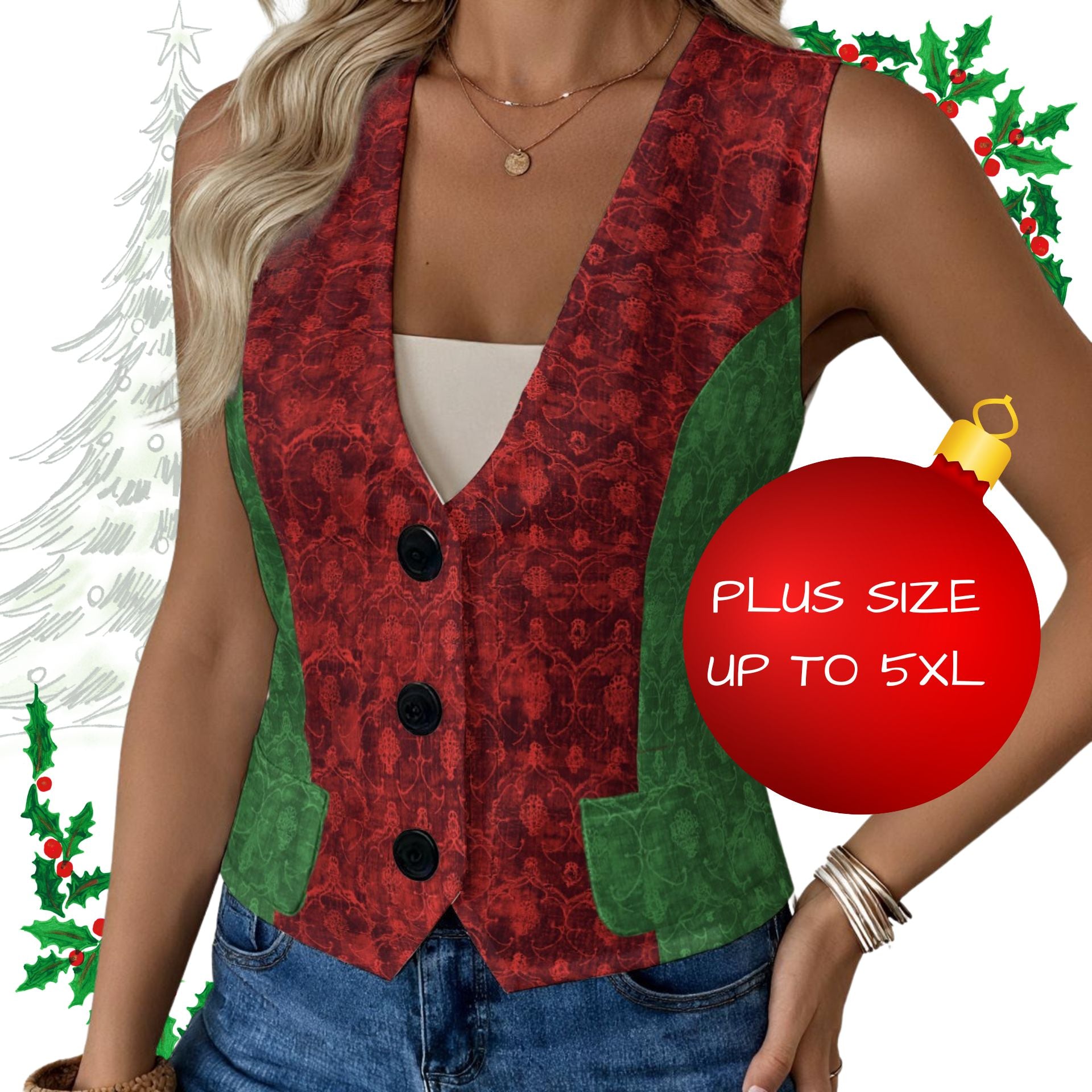Elegant holiday red and green damask printed cotton waistcoat vest with 3 buttons and pocket flaps (no actual pockets, sorry about that) in a snug tailored femme fit. US women's sizes S-5XL